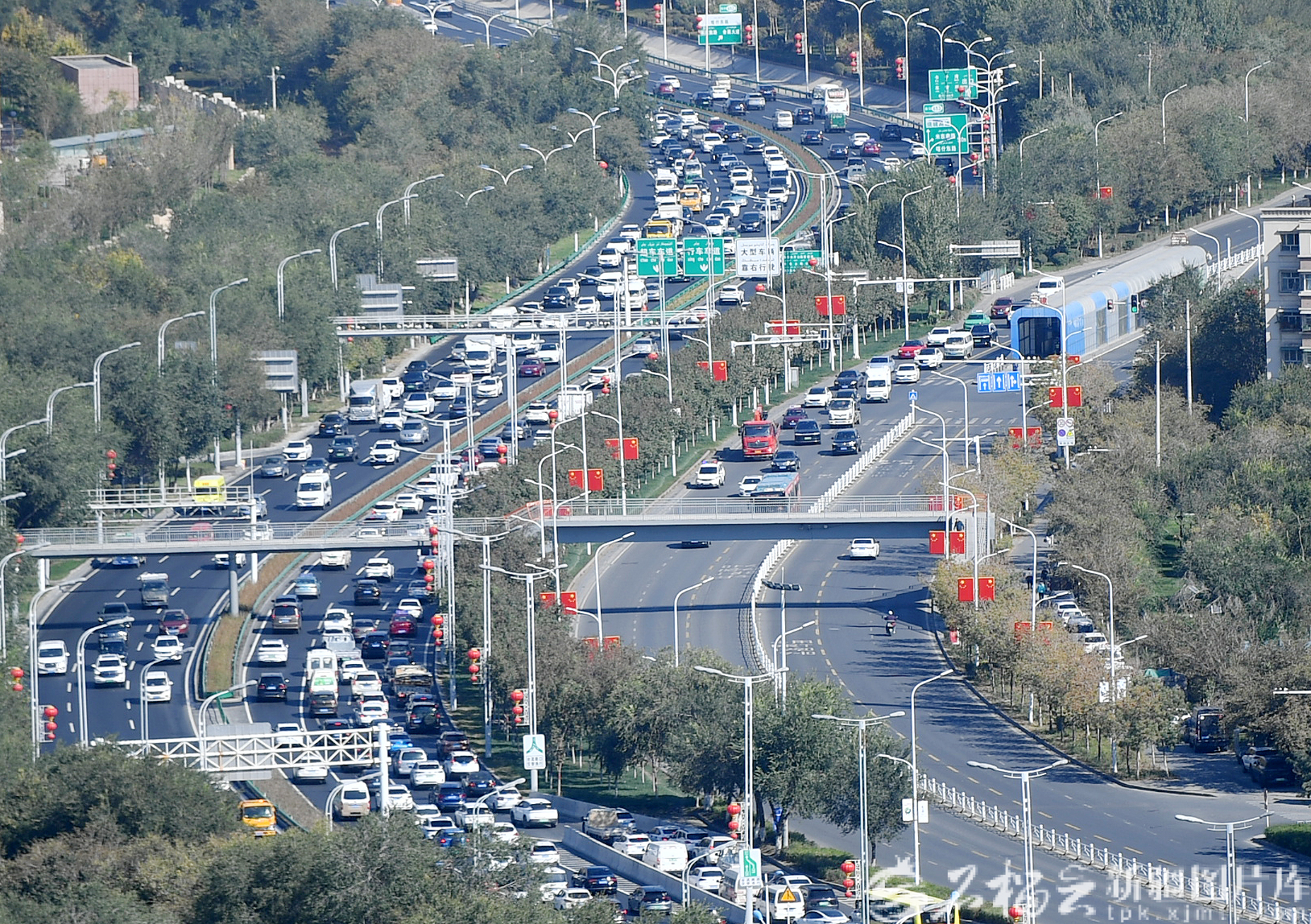 9月29日,市民走過紅旗招展的烏魯木齊市西大橋。