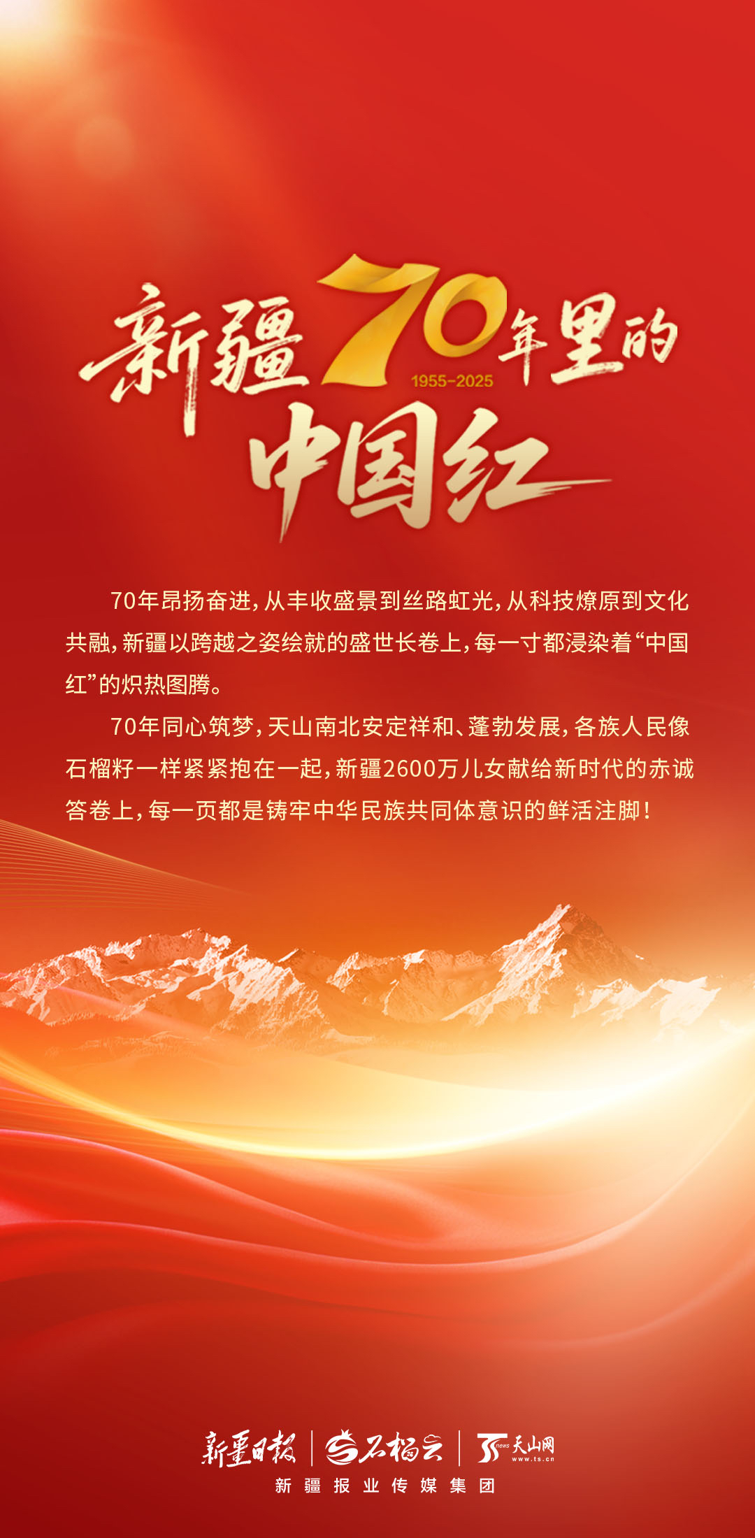 70年昂揚(yáng)奮進(jìn),從豐收盛景到絲路虹光,從科技燎原到文化共融,新疆以跨越之姿繪就的盛世長(zhǎng)卷上,每一寸都浸染著“中國(guó)紅”的熾熱圖騰。