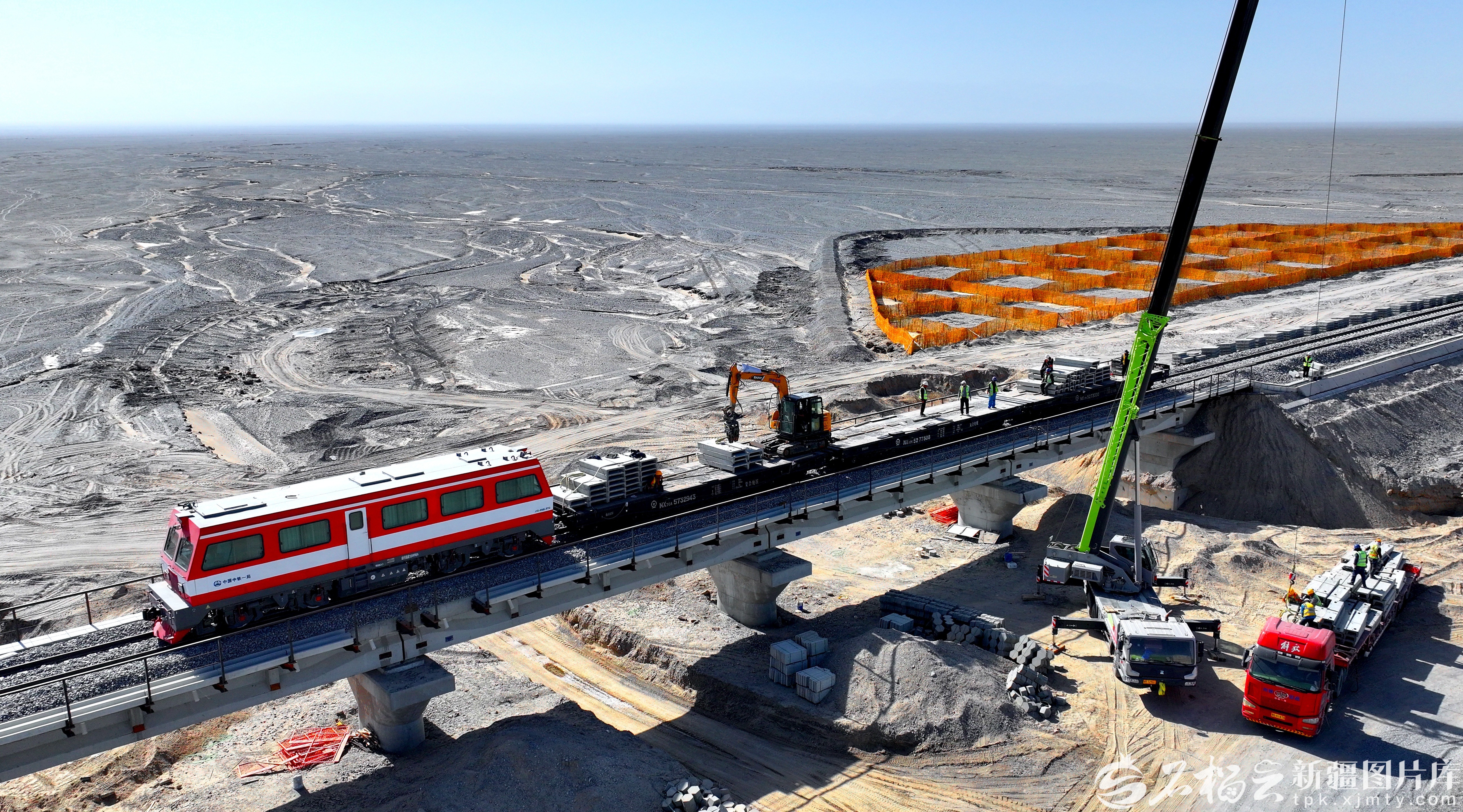 10月3日,工人在羅若鐵路米蘭至羅布泊(DK170+850)段進行鋪軌作業(yè)。國慶、中秋假期,中鐵一局近300名建設(shè)者堅守一線,搶抓施工進度,確保項目加速推進。 文永松攝