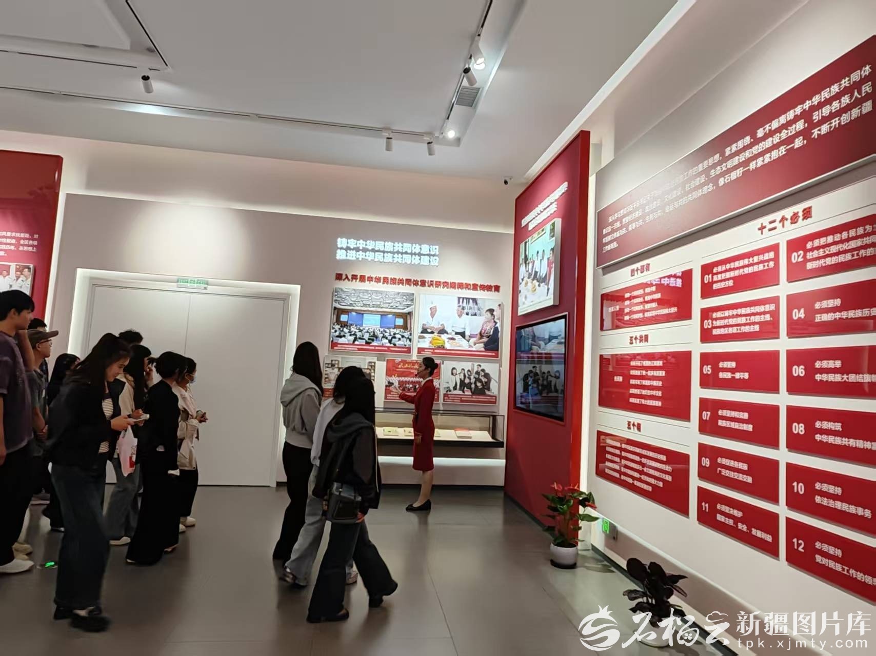 10月3日,觀眾在烏魯木齊文化中心展覽館二樓“美麗新疆鑄輝煌”展區(qū)參觀鑄牢中華民族共同體意識宣傳教育的展板。天山網(wǎng)-新疆日報記者 王亞蕓攝