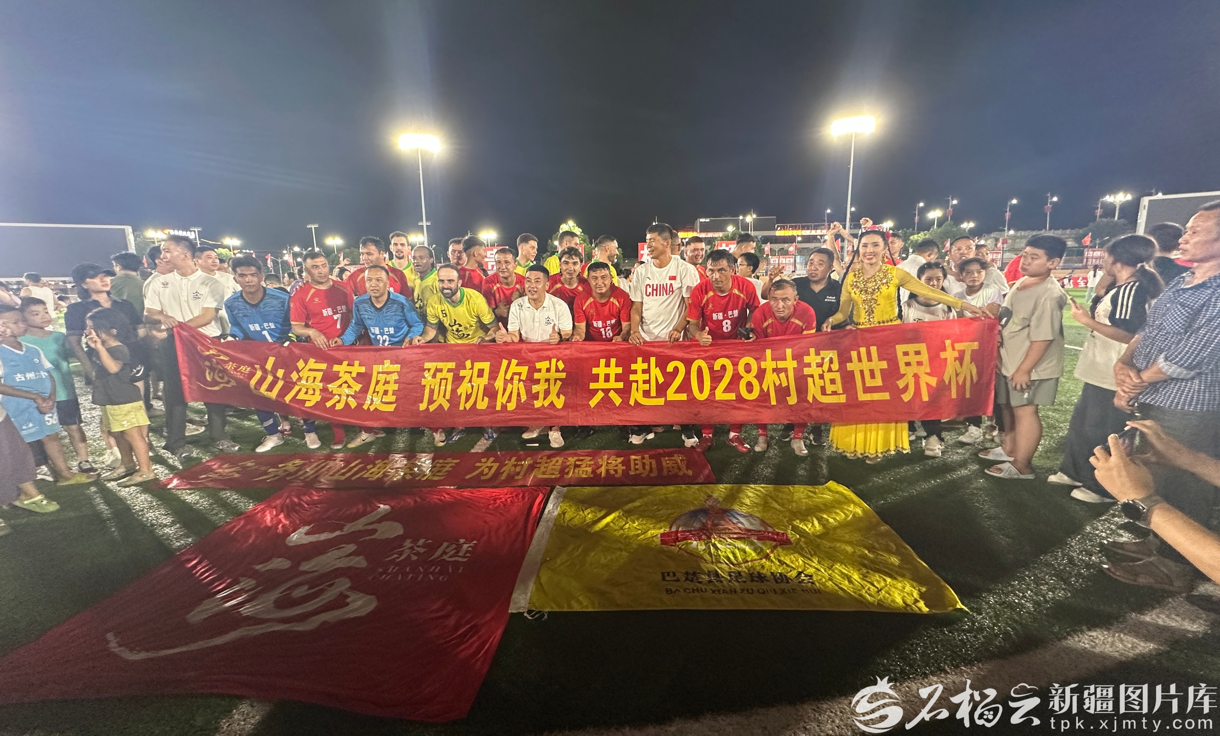巴楚胡楊足球隊(duì)在貴州榕江縣村超賽場(chǎng),與巴西教練聯(lián)隊(duì)在賽后合影。凱賽爾攝