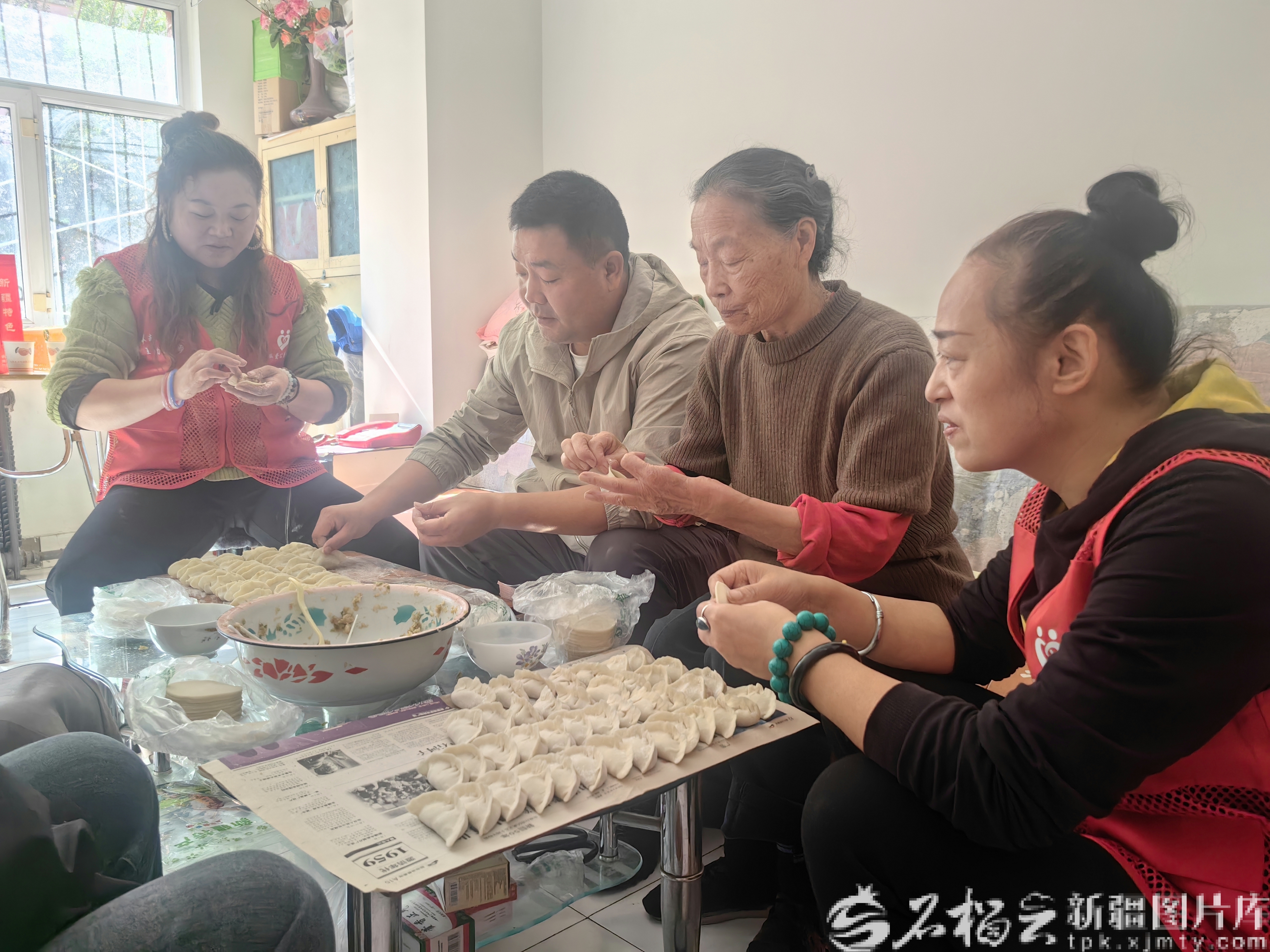 10月6日,烏魯木齊市青年志愿服務(wù)協(xié)會志愿者和老人一起包餃子。馬珉攝