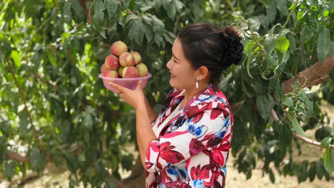 10月9日,在和田縣布扎克鄉(xiāng)托萬(wàn)喀什村村民凱麥爾妮薩·麥麥提艾力的果園里,她正忙著采摘今年秋天最后一批桃子?!凹依?畝果園今年能賺8萬(wàn)多塊?!彼χ闫鹗找尜~,自從2019年開始種桃,跟著鄉(xiāng)林業(yè)站學(xué)了科學(xué)種植技術(shù),桃子的產(chǎn)量和品質(zhì)一年比一年好。如今新房蓋起來(lái)了,小汽車也開上了?!叭兆泳拖襁@桃兒一樣,越過越甜?!?span style="font-family: 微軟雅黑, "Microsoft YaHei"; text-wrap-mode: wrap;">她說(shuō)。