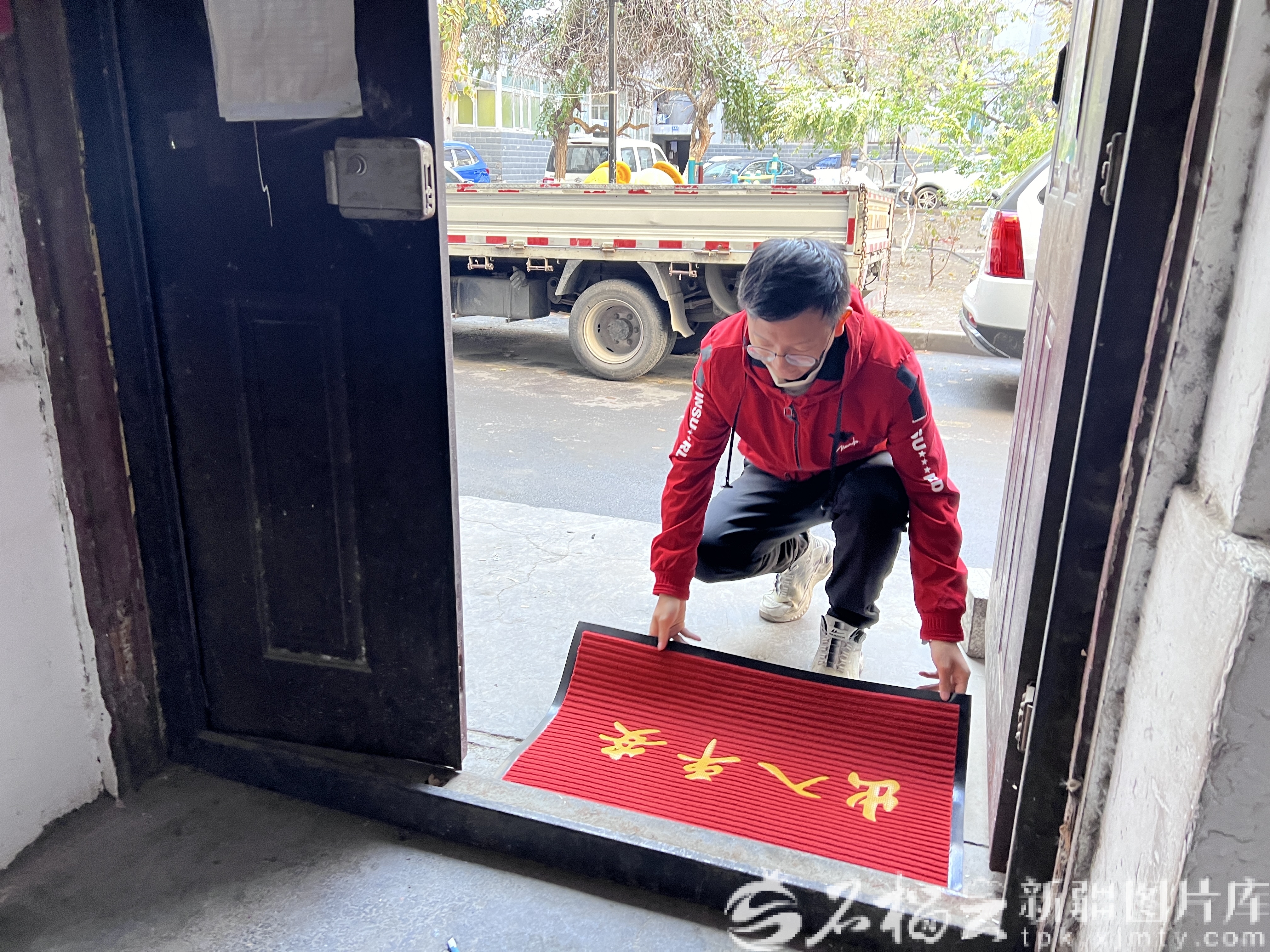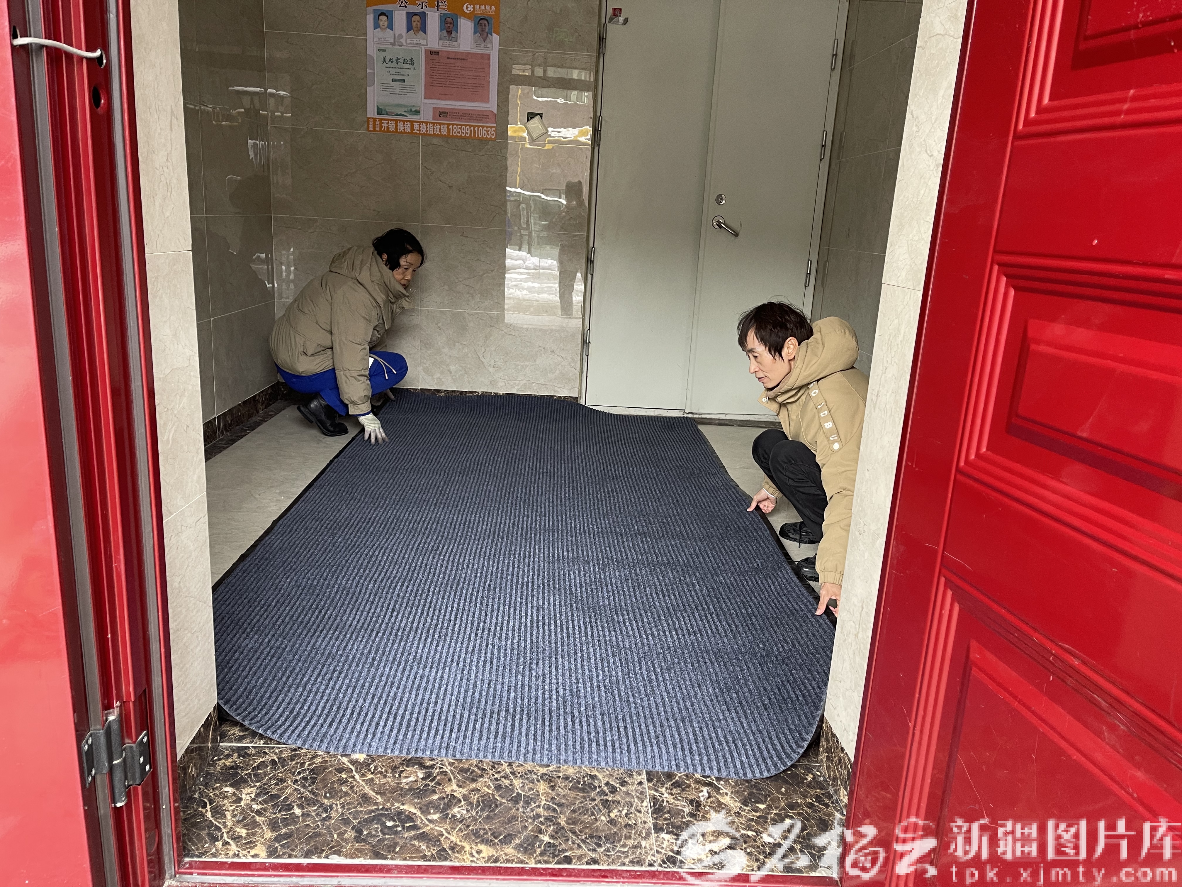 10月15日,烏魯木齊經(jīng)開區(qū)(頭屯河區(qū))天麓花園小區(qū),物業(yè)公司工作人員在樓道口鋪設(shè)防滑地毯。劉超楠攝