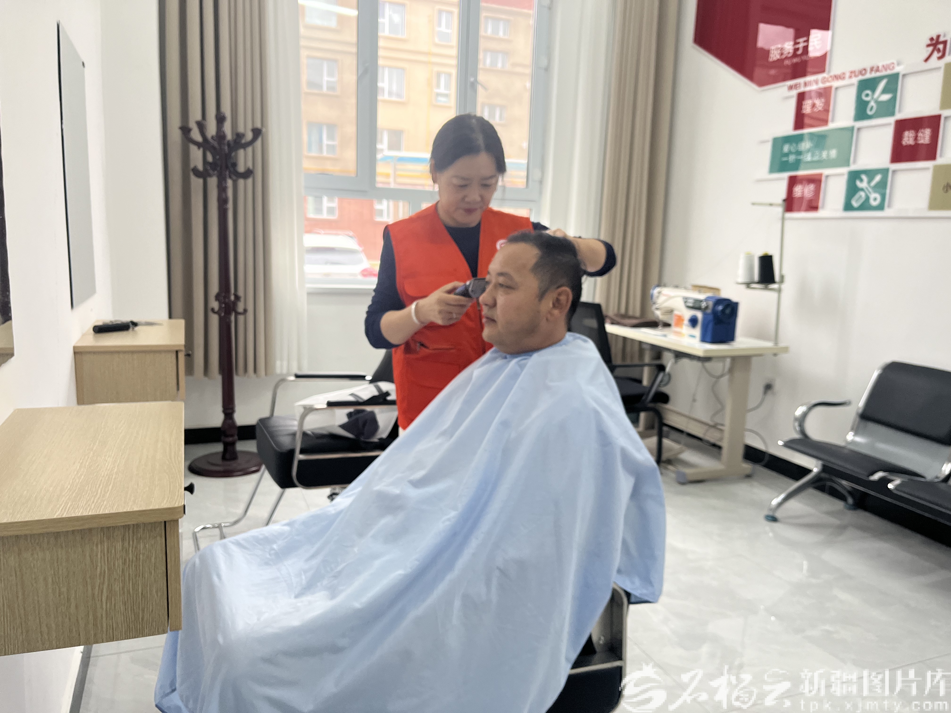 10月20日,“一剪美”理發(fā)店店主陳潔參加幸福社區(qū)開展的公益活動,給小區(qū)居民免費(fèi)理發(fā)。天山網(wǎng)-新疆日報記者 白素君攝