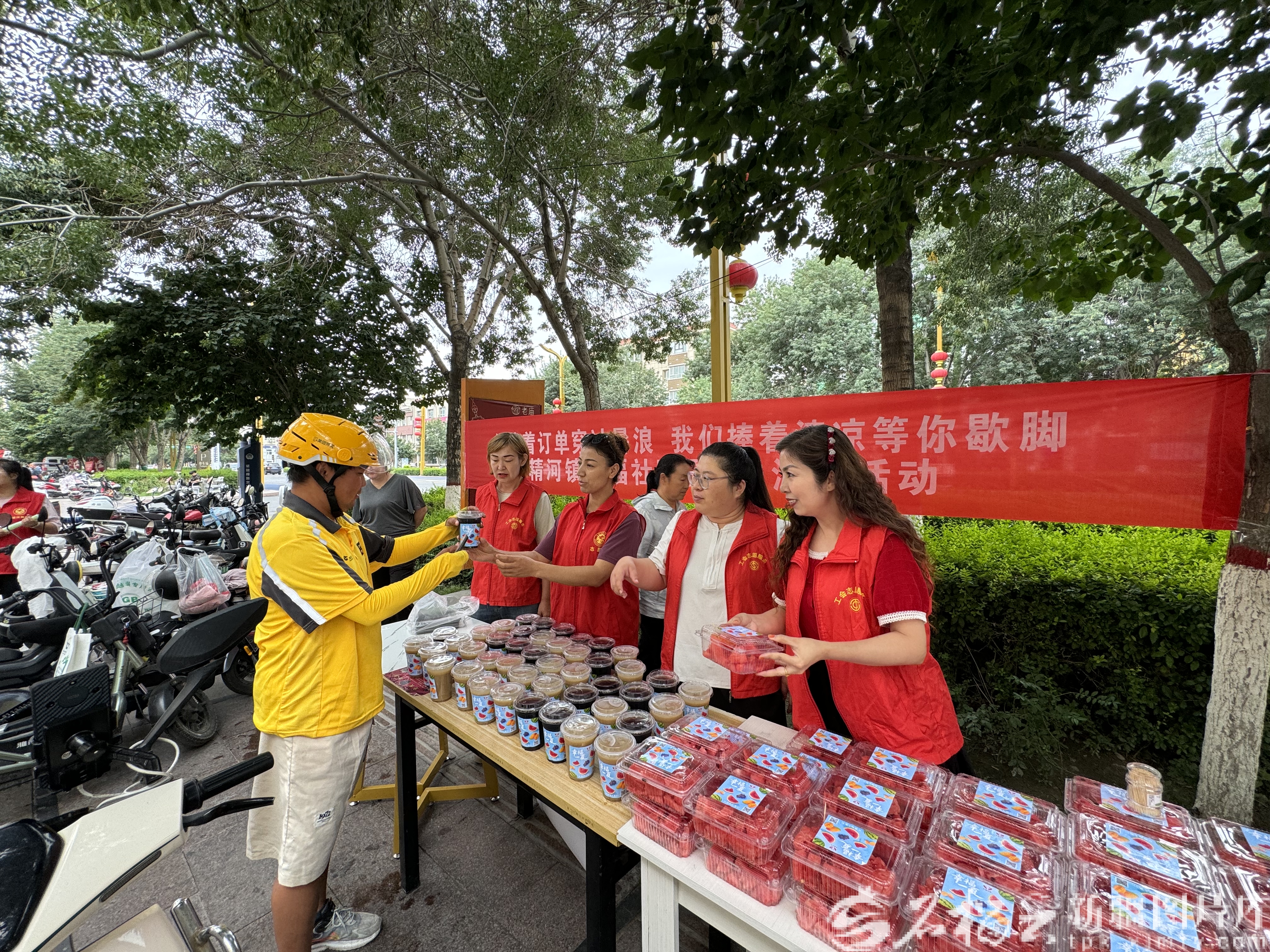 7月16日,幸福社區(qū)的志愿者為外賣配送員送上冰鎮(zhèn)飲料和西瓜等消暑食品。那英攝