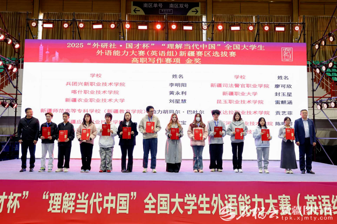 11月2日,2025年“外研社·國才杯”“理解當(dāng)代中國”全國大學(xué)生外語能力大賽(英語組)新疆賽區(qū)選拔賽,高職寫作賽項(xiàng)金獎(jiǎng)?lì)C獎(jiǎng)典禮現(xiàn)場。石河子大學(xué)供圖
