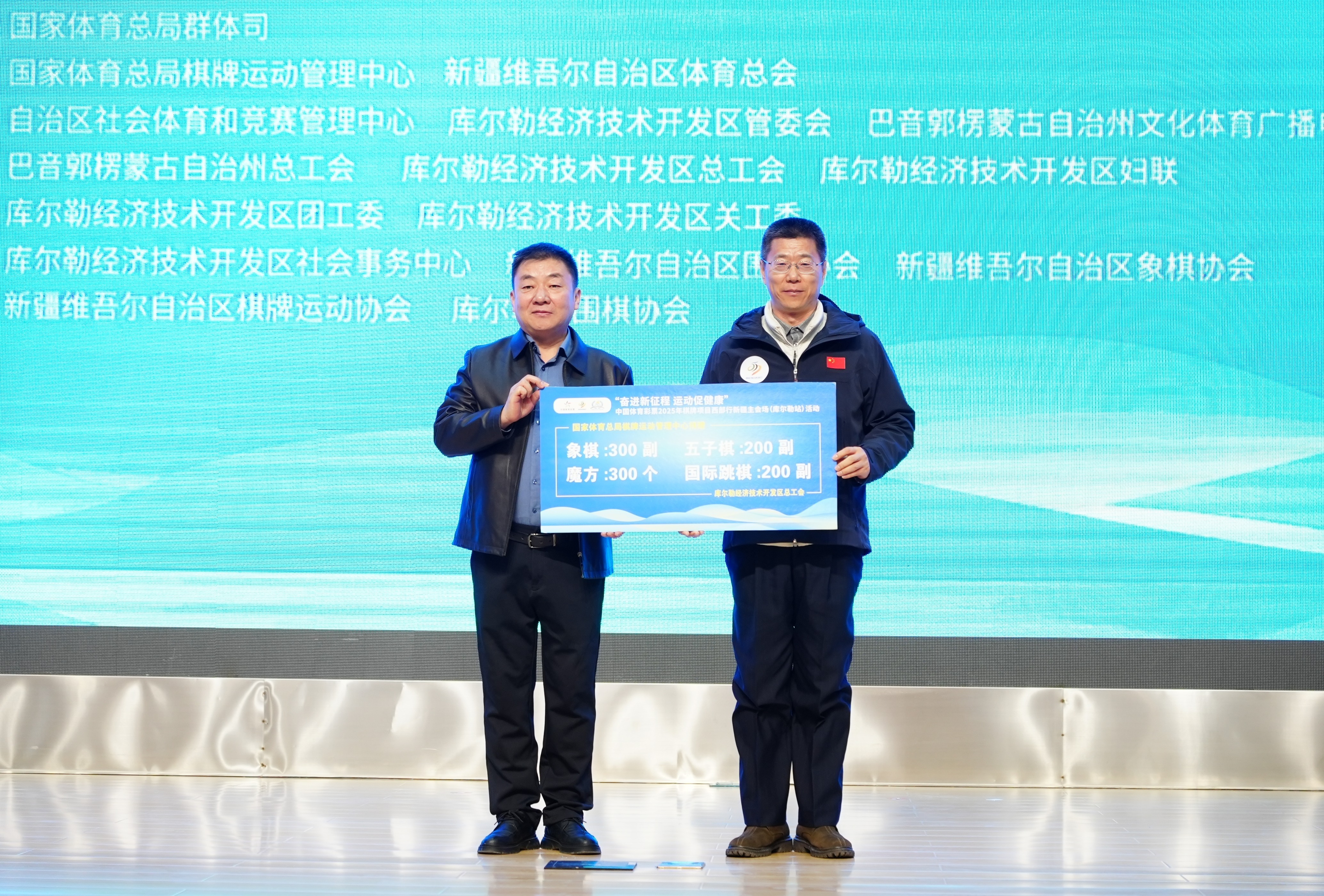 本次活動(dòng)由國(guó)家體育總局群體司指導(dǎo),國(guó)家體育總局棋牌運(yùn)動(dòng)管理中心、新疆維吾爾自治區(qū)體育總會(huì)聯(lián)合主辦。啟動(dòng)儀式上,國(guó)家體育總局棋牌運(yùn)動(dòng)管理中心向庫(kù)爾勒經(jīng)濟(jì)技術(shù)開發(fā)區(qū)總工會(huì)捐贈(zèng)了象棋、五子棋、魔方、國(guó)際跳棋等一批體育器材,進(jìn)一步推動(dòng)基層棋牌運(yùn)動(dòng)發(fā)展,豐富全民健身內(nèi)容,讓智力運(yùn)動(dòng)惠及更多群眾。