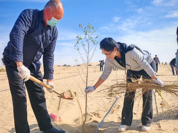 植樹現(xiàn)場(chǎng),干部群眾正在種植紅柳、梭梭等防沙樹種。
