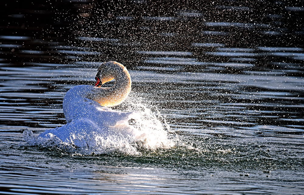 它們或曲項(xiàng)如問(wèn),長(zhǎng)喙輕點(diǎn),在如鏡的水面泛起一圈圈漾著金邊的漣漪;或舒翅欲飛,在氤氳的暖霧與璀璨的霞光間,劃出一道道晶亮的軌跡,仿佛不是在寒水中游弋,而是在熔化的金波上滑行。更有對(duì)對(duì)愛(ài)侶,長(zhǎng)頸交疊,彎成一顆顆溫柔的心的形狀,倒影落在溫暖的泉水中,宛如竊竊私語(yǔ),訴說(shuō)著千里征途中不曾分離的繾綣。