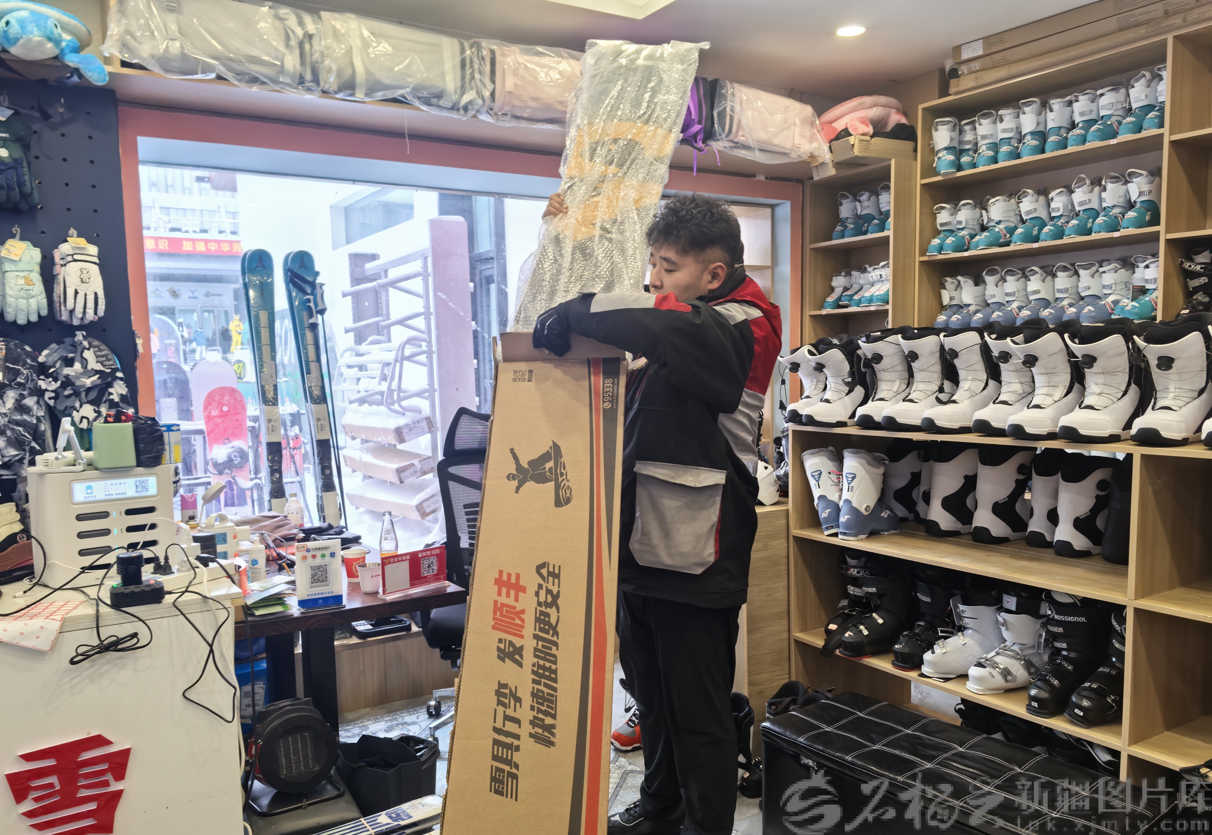 12月17日,阿勒泰市將軍山國際滑雪場,順豐快遞員在打包發(fā)運的雪板。艾麗米拉·巴合達艾力攝