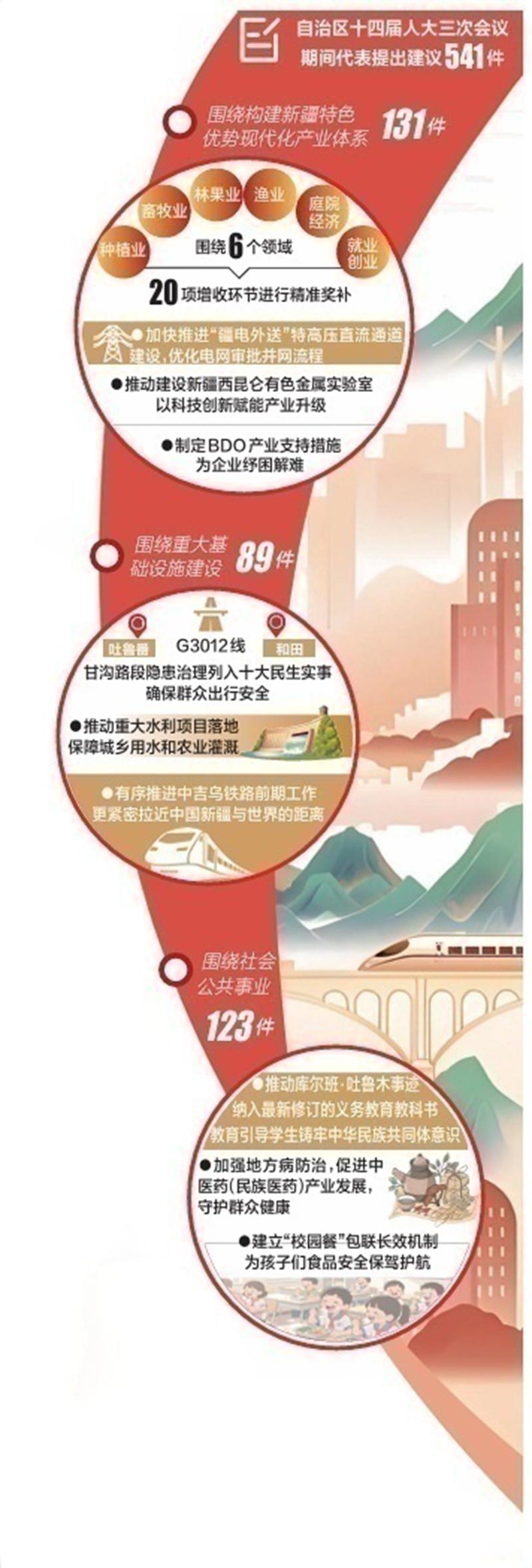增進民生福祉,回應群眾期盼。123件涉及社會公共事業(yè)的建議,承載著群眾對美好生活的向往——自治區(qū)教育廳采納代表建議,主動與教育部教材局對接,推動庫爾班·吐魯木事跡納入最新修訂的義務教育教科書,教育引導學生鑄牢中華民族共同體意識;自治區(qū)衛(wèi)生健康委加強地方病防治,促進中醫(yī)藥(民族醫(yī)藥)產(chǎn)業(yè)發(fā)展,守護群眾健康;自治區(qū)市場監(jiān)管局建立“校園餐”包聯(lián)長效機制,為孩子們的食品安全保駕護航……