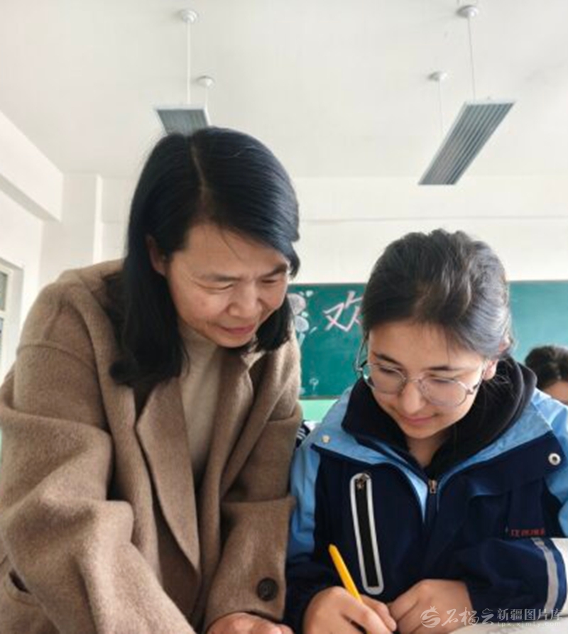 1月21日,在克州江西實驗中學(阿克陶縣雪松中學)高二(1)班教室里,江西援疆教師謝久蓮在課間輔導學生。 漆琪攝