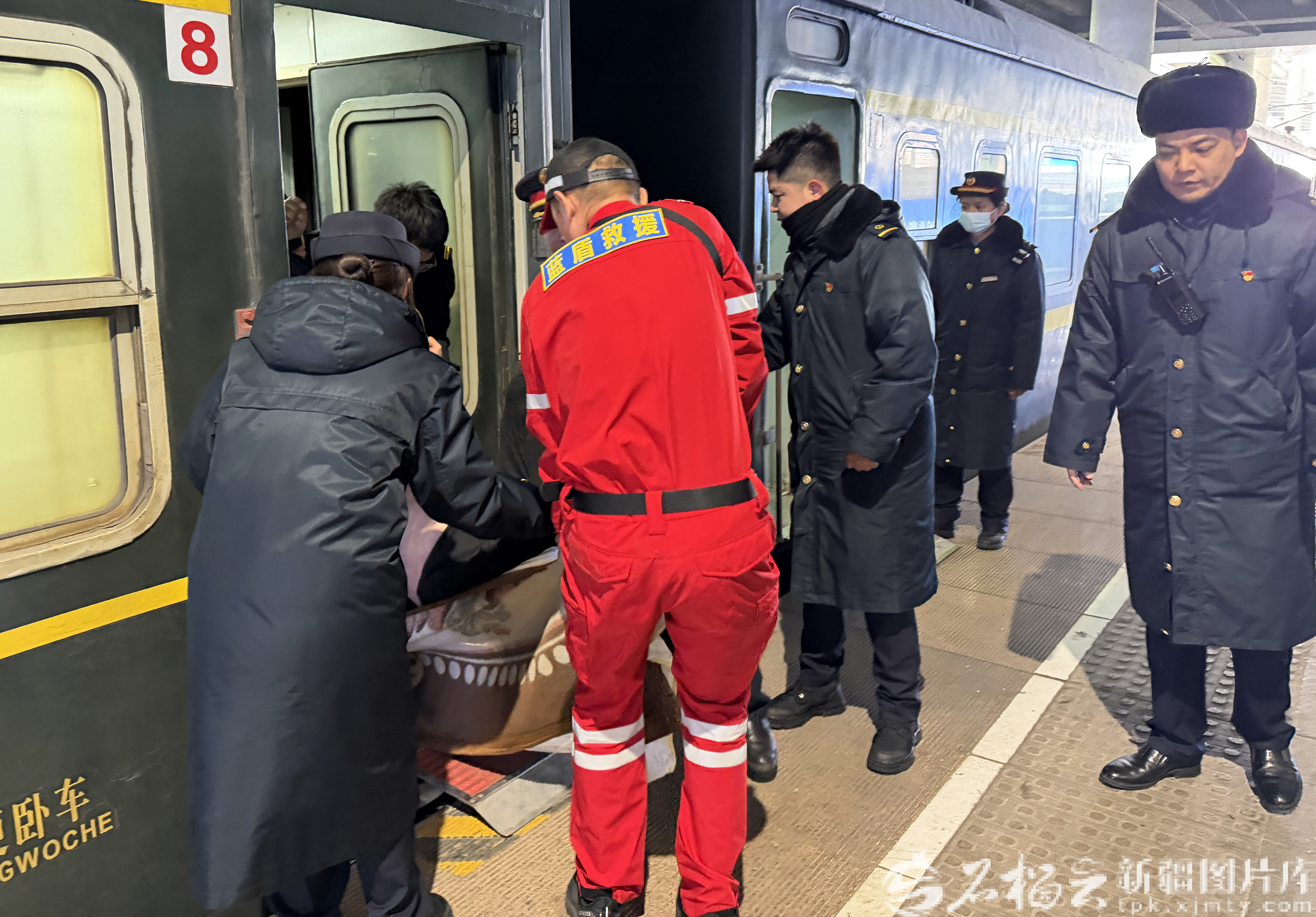 2月2日,藍(lán)盾救援隊(duì)隊(duì)員協(xié)助鐵路工作人員將一名心臟病患者抬下列車。圖/楊琛龍?zhí)峁?/span>