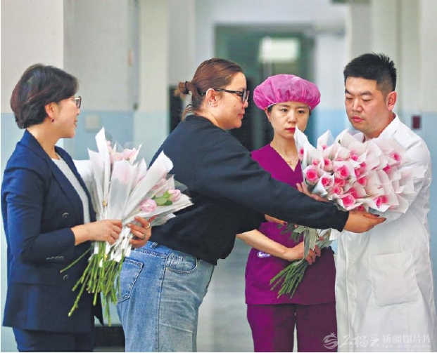 2月2日,工作人員將云南月季送到新疆醫(yī)科大學(xué)第一附屬醫(yī)院醫(yī)護(hù)人員手中。天山網(wǎng)-疆日報記者李瑞