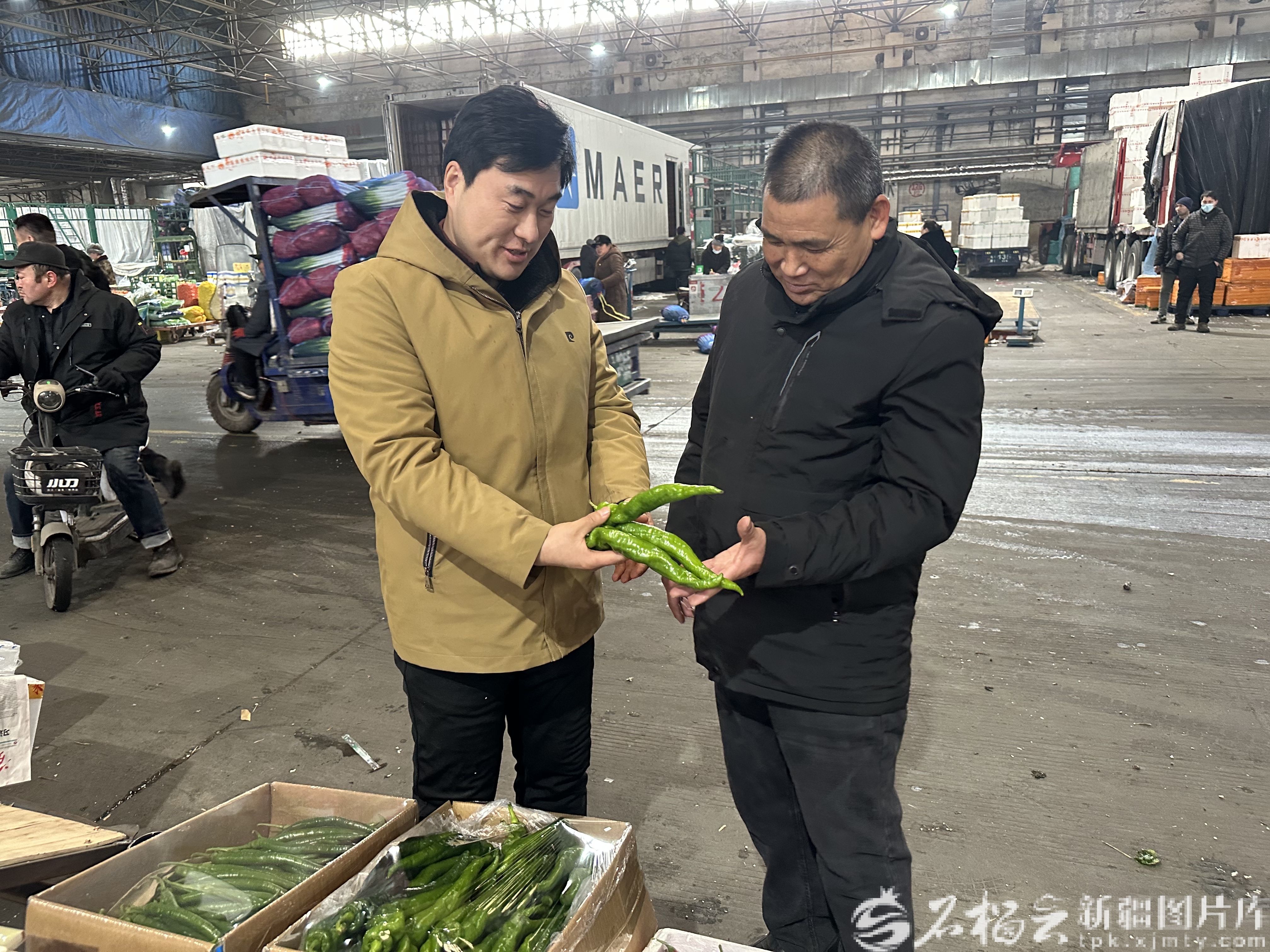 2月12日凌晨4時(shí),新疆九鼎農(nóng)產(chǎn)品批發(fā)市場的寒氣還裹著夜的濃黑,蔬菜交易中心2號(hào)大棚里卻早已亮如白晝。三輪車的剎車聲、貨車的倒車提示音混著此起彼伏的吆喝聲。