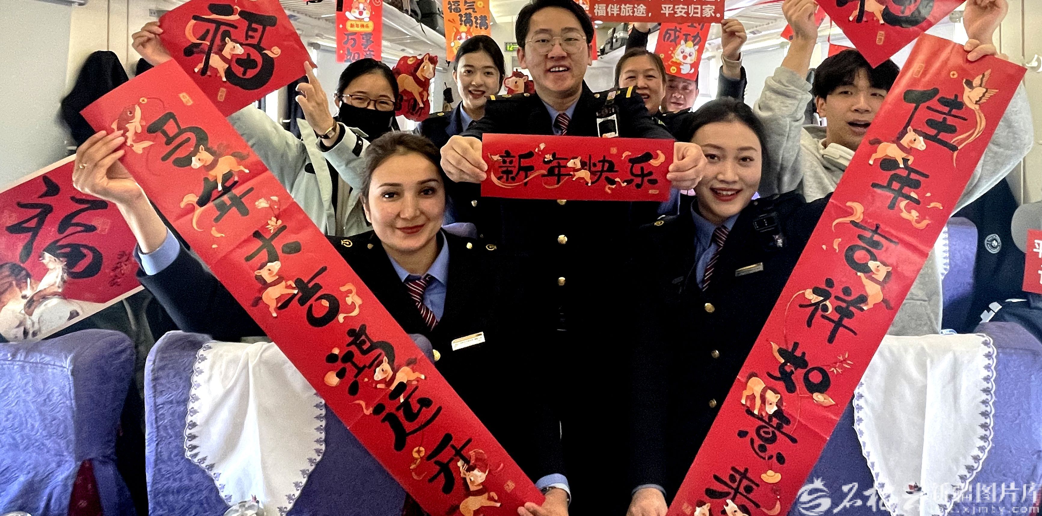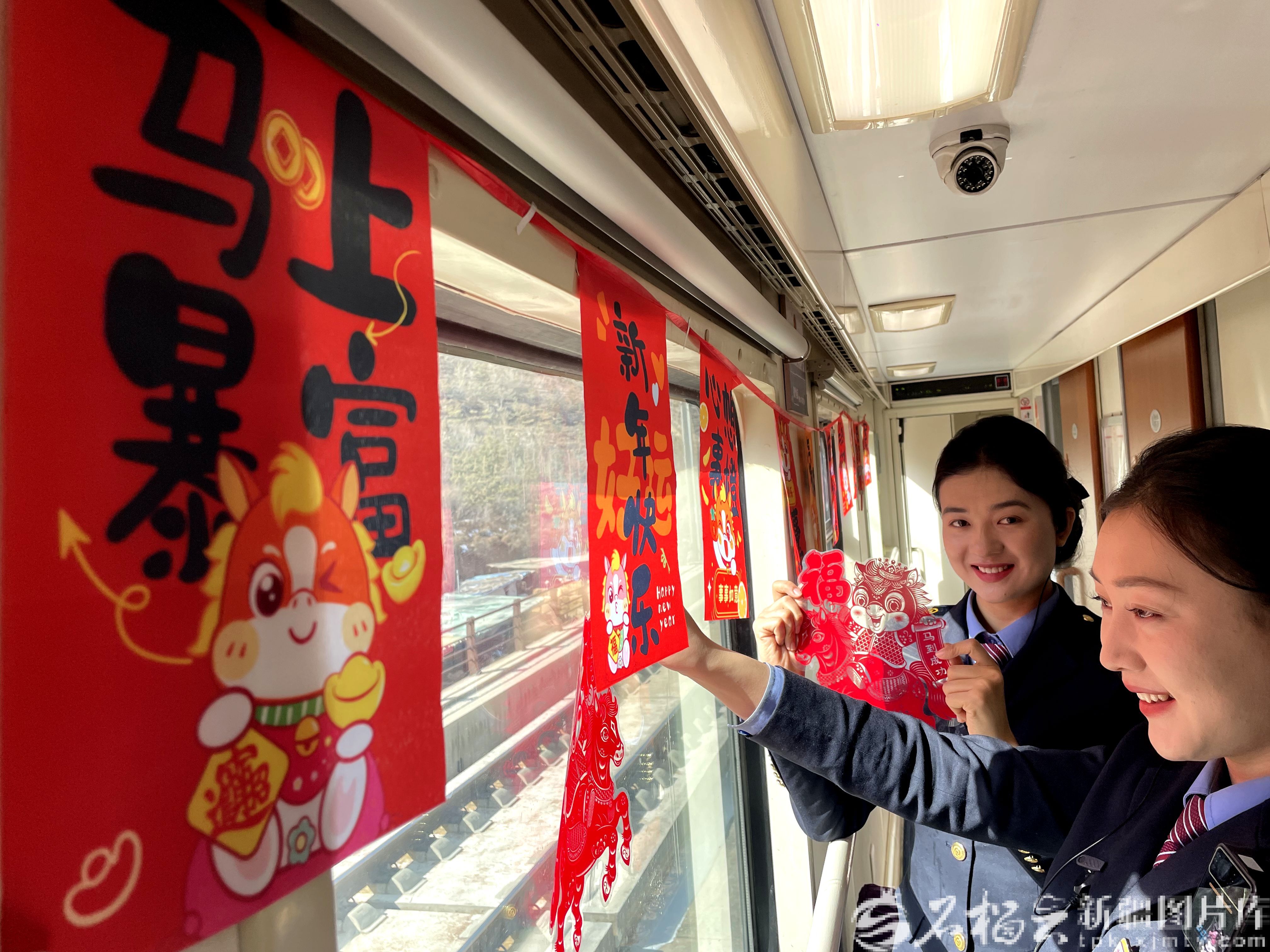 在烏魯木齊客運段漢口車隊值乘的Z294次烏魯木齊至武昌列車上,車廂年味濃郁。車窗上貼著紅彤彤的窗花,喜慶的“?!弊?、春聯(lián)和鮮紅的中國結(jié),將車廂裝點得格外溫馨,洋溢著節(jié)日氛圍。