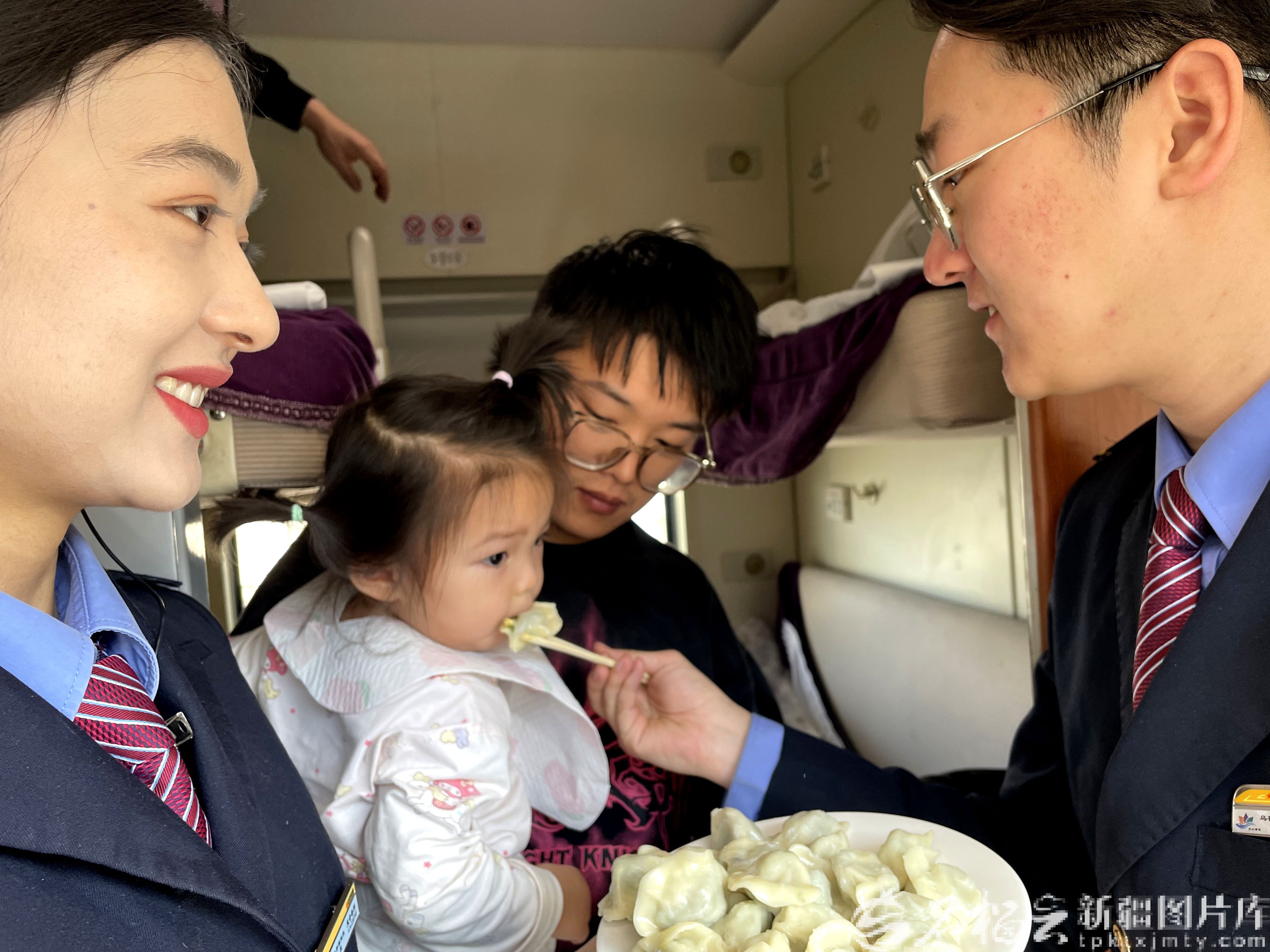 2月16日,除夕,Z294次列車長王新宇(右)給小乘客郭思涵喂餃子。天山網(wǎng)-新疆日報記者 楊斌攝