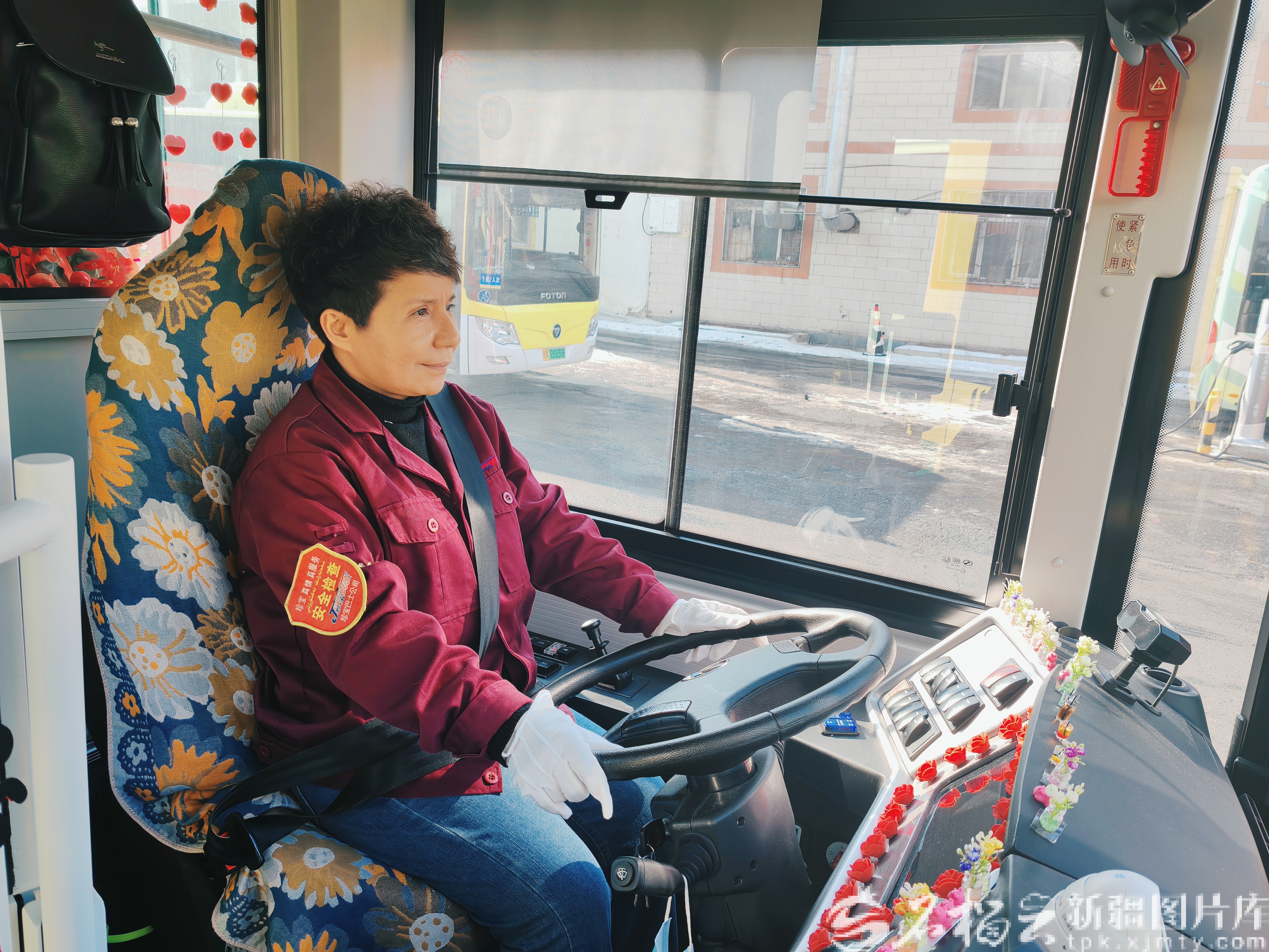 阿瓦古力·賣買提坐進(jìn)61路新能源車公交駕駛室,按下車鑰匙上的啟動(dòng)鍵,“嗡”的一聲輕響,儀表盤的綠燈跳亮,車廂頂燈次第亮起,紅色的新年裝飾布置在車廂各個(gè)角落。她說(shuō),這樣才有新年的氣氛。
