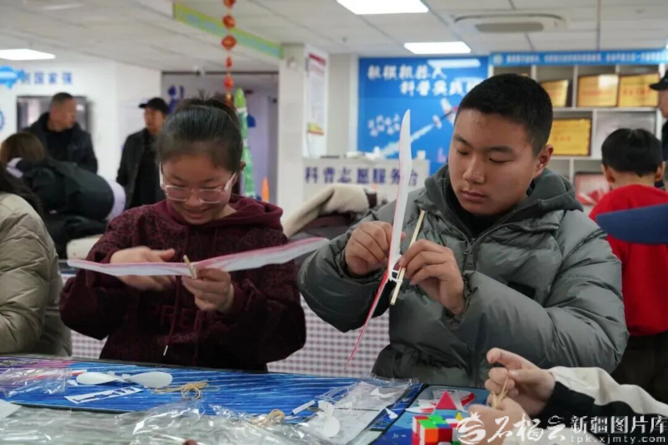2月17日,哈密市伊州區(qū)新時(shí)代文明實(shí)踐中心內(nèi),“我在新時(shí)代文明實(shí)踐中心過大年”系列活動(dòng)中,科普活動(dòng)區(qū)幾位青少年在制作簡易飛機(jī)模型。楊俊超 攝