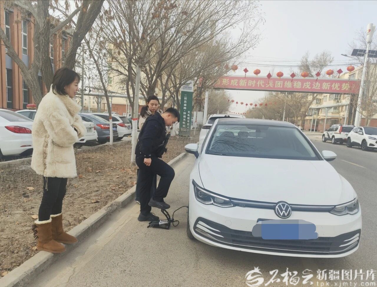 13時(shí)30分,二團(tuán)綜治中心門口,張女士望著癟癟的車胎急得團(tuán)團(tuán)轉(zhuǎn),春節(jié)期間修理店大都關(guān)門了,翻遍通訊錄也求助無(wú)門,只得撥通報(bào)警電話求助。