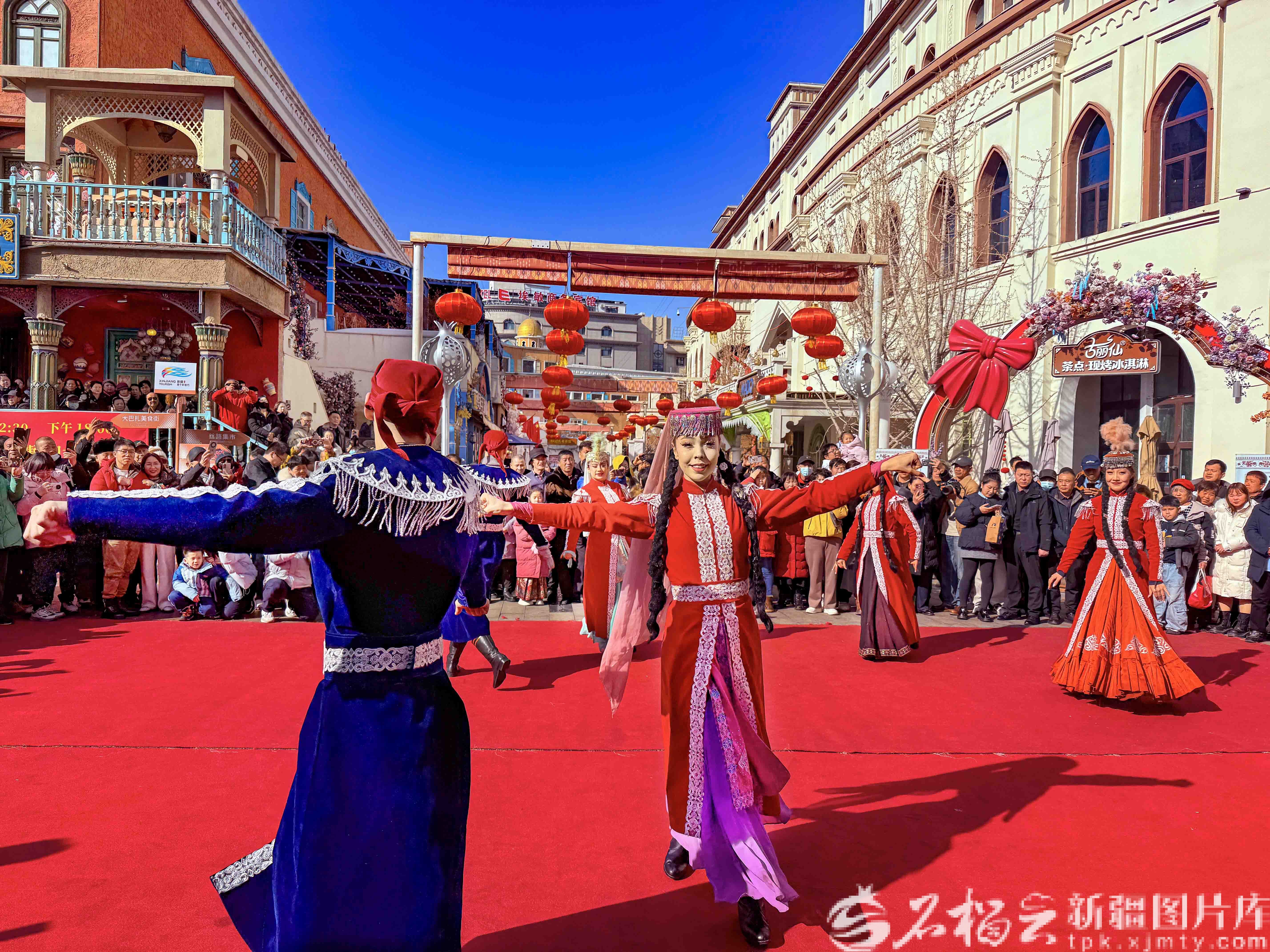 2月20日,演員在新疆國(guó)際大巴扎步行街二期疆來城為游客表演舞蹈《巴扎歡歌》。