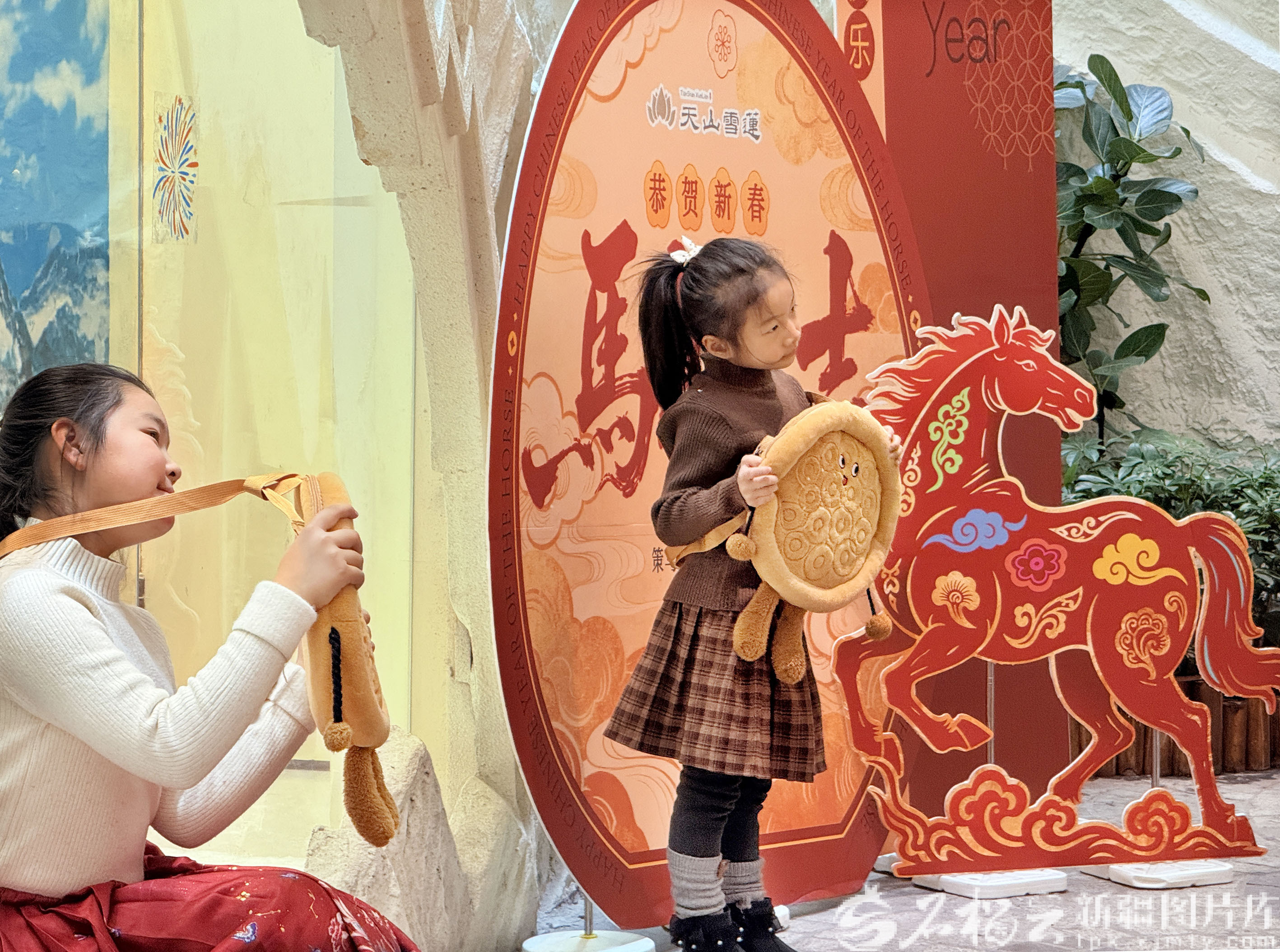 2月20日,小朋友在新疆國(guó)際大巴扎步行街二期疆來城拍照打卡。