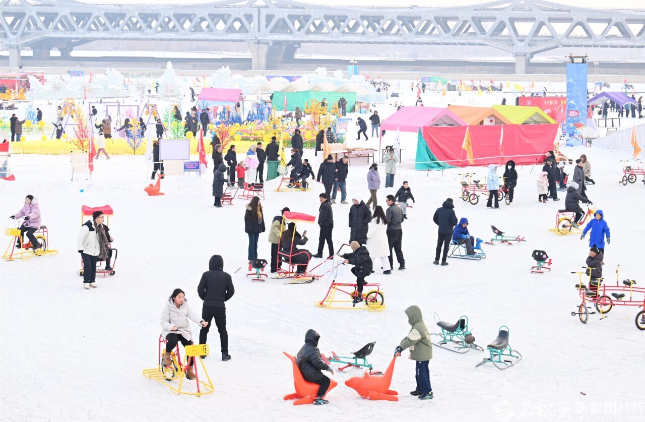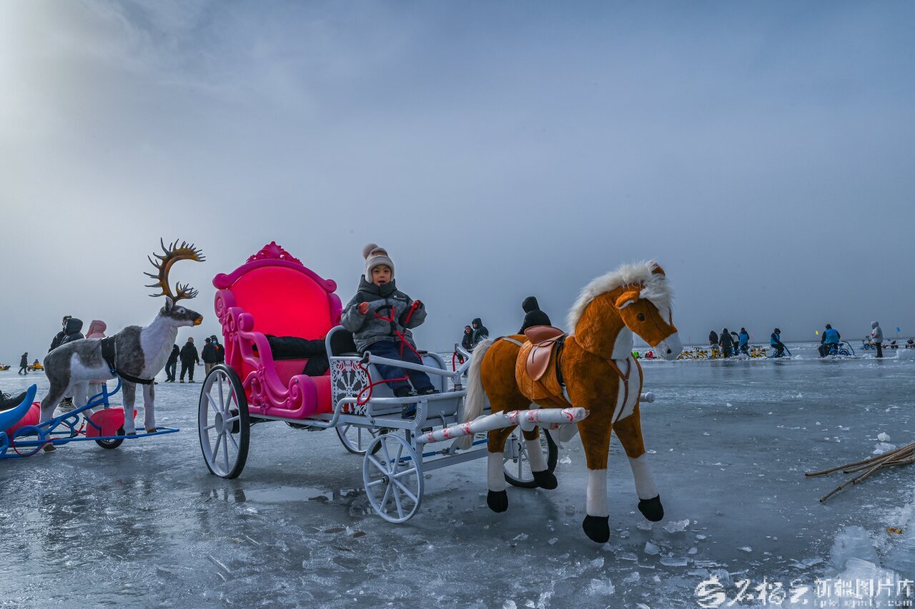 在和碩縣博斯騰湖金沙灘景區(qū),游客體驗(yàn)冰上樂趣。韓峻攝