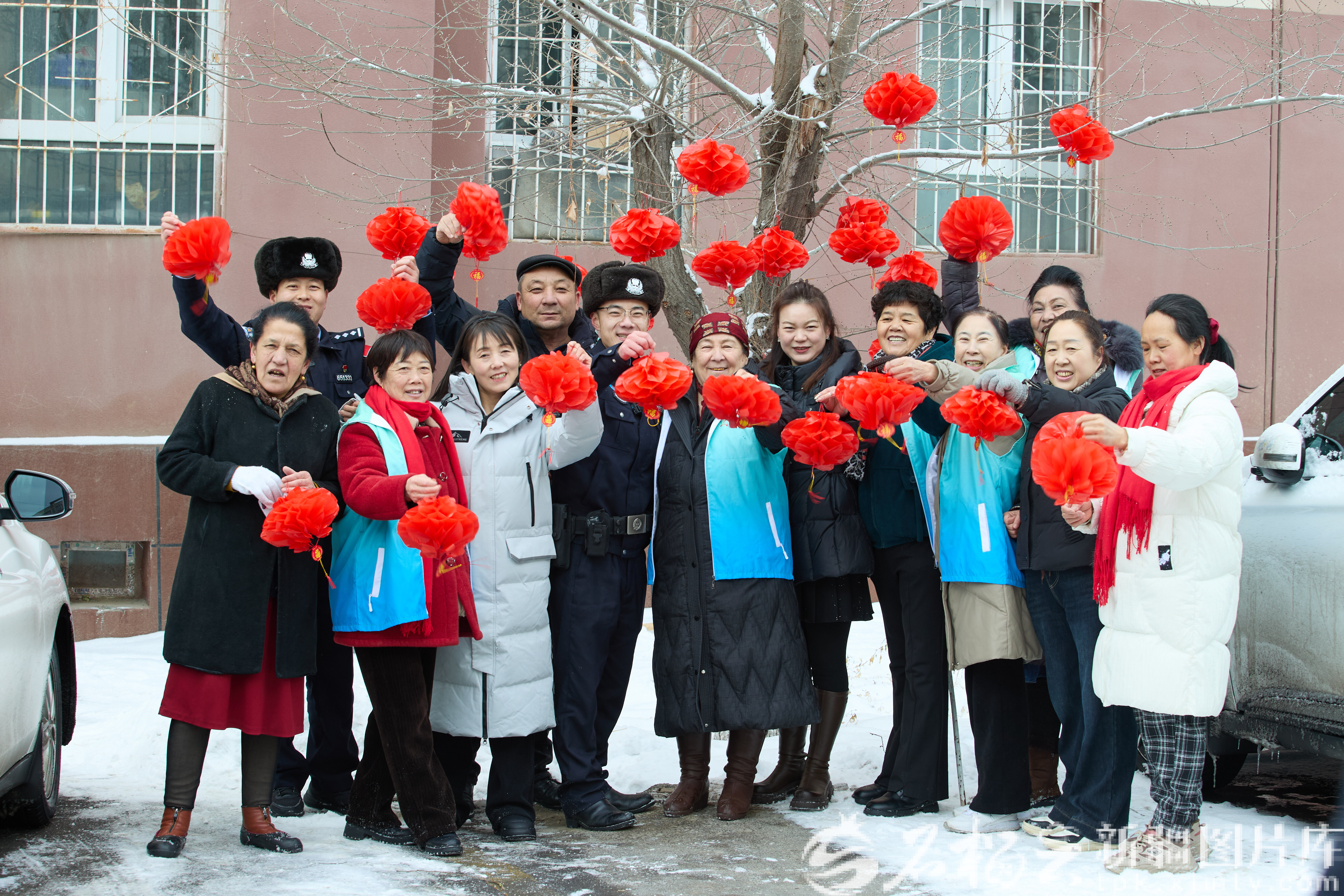 2月15日,記者和“星火義警”志愿服務(wù)隊(duì)的志愿者們掛燈籠后合影留念。蘆勝磊攝