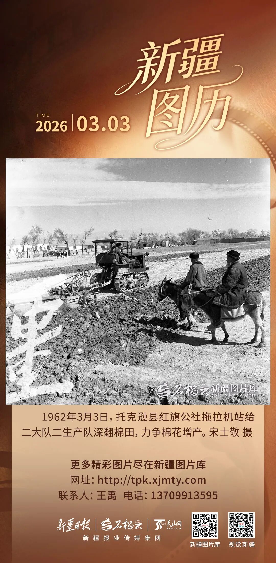 1962年3月3日,托克遜縣紅旗公社的棉田里農(nóng)機轟鳴。操作人員駕駛拖拉機,為二大隊二生產(chǎn)隊棉田深耕整地。