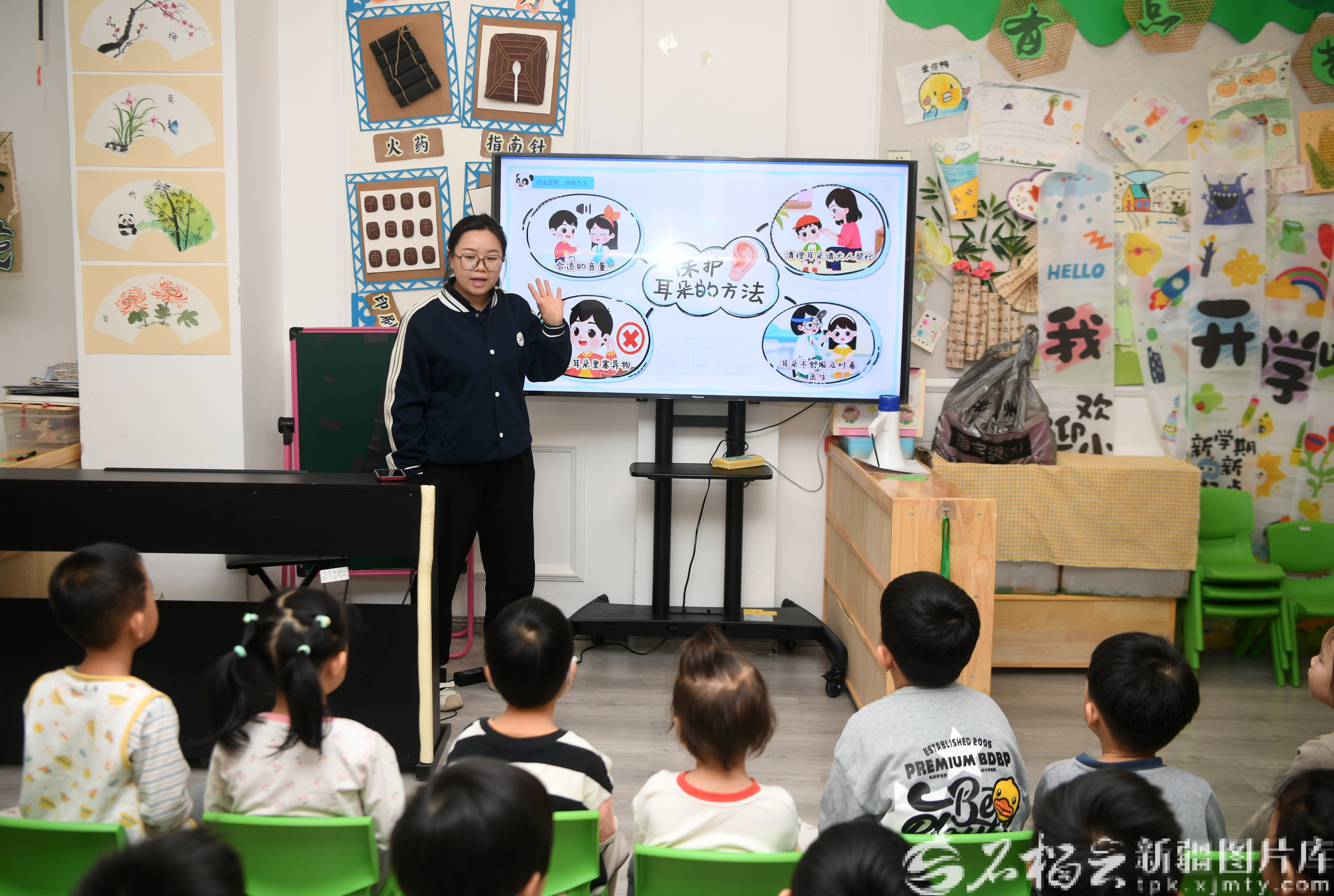 3月3日,幼兒園教師給孩子們講解愛耳護(hù)耳的方法。