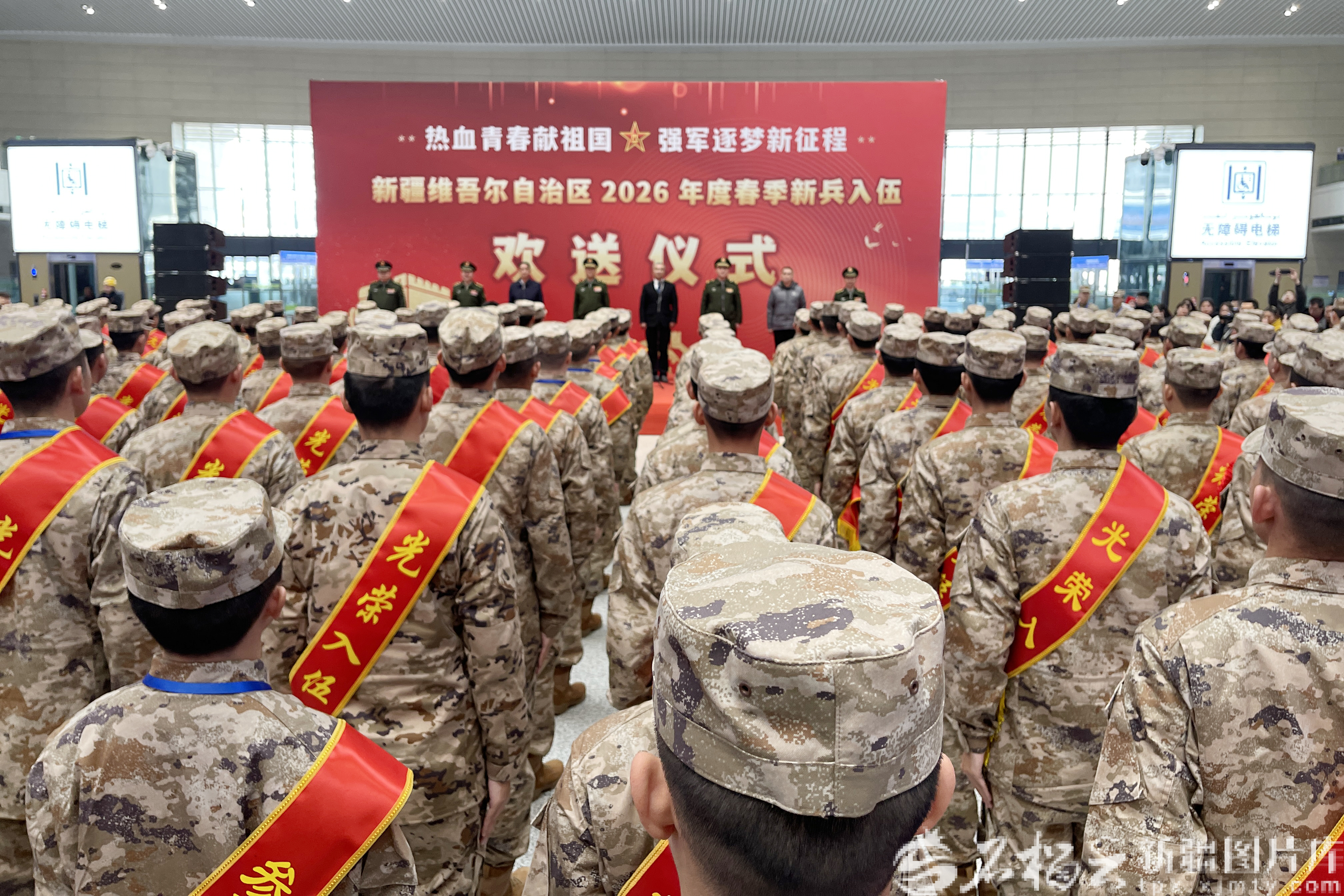 天山網(wǎng)-新疆日報(bào)訊(記者楊舒涵攝影報(bào)道)3月15日,烏魯木齊站內(nèi)軍歌嘹亮、掌聲雷動(dòng),一場莊重?zé)崃业男卤鴼g送儀式在這里舉行。身著迷彩服、胸佩大紅花的新兵整齊列隊(duì),帶著家鄉(xiāng)人民的囑托與期盼,即將踏上列車,開啟保家衛(wèi)國的軍旅征程。