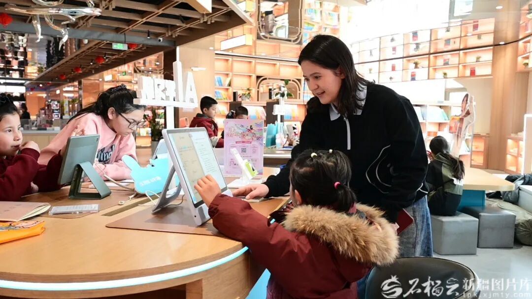 3月14日,喀什新華書店工作人員幫助小朋友查找電子課本。權(quán)雅妮 攝