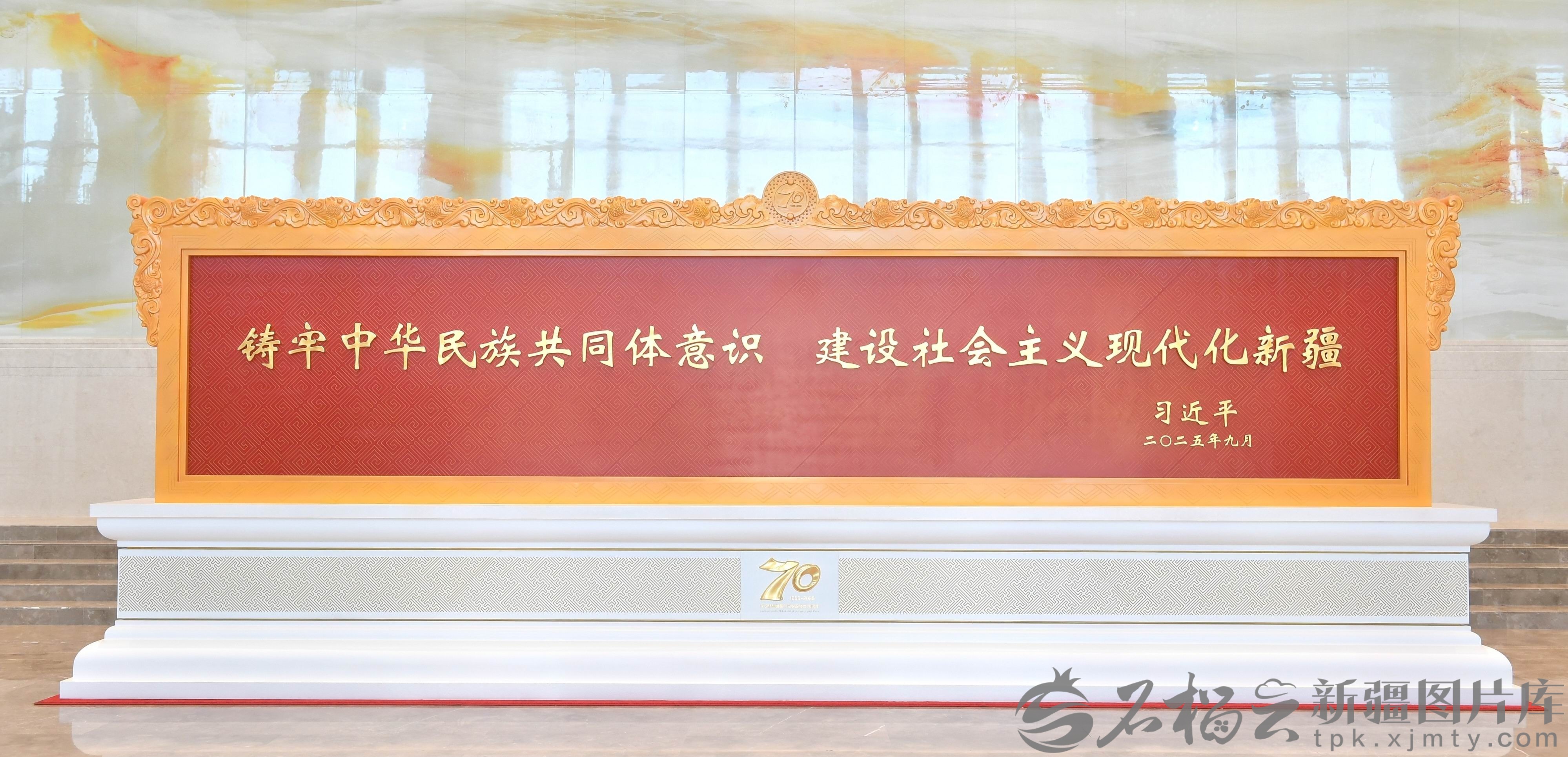 賀匾正面為習(xí)近平總書記題詞,造型參考傳統(tǒng)影壁與座屏,上沿中心的玉璧以中國傳統(tǒng)重環(huán)玉璧為靈感,多層同心圓包裹“70”,象征“中華民族一家親,同心共筑中國夢”,玉璧中心的金珠串聯(lián)圓環(huán),體現(xiàn)“珠聯(lián)璧合”的和諧精神。賀匾上沿及兩側(cè)的紋飾主體為敦煌卷草石榴紋,卷草連綿寓意絲路文明交融與團(tuán)結(jié)永恒,彰顯中華民族“同呼吸、共命運(yùn)、心連心”的共同體意識(shí);石榴既象征“各民族像石榴籽一樣緊緊抱在一起”,也體現(xiàn)新疆“瓜果飄香”的地域特色;兩側(cè)飛檐造型取形中國傳統(tǒng)建筑,翹角匯聚成向心之勢,寓意“鑄牢中華民族共同體意識(shí)”。賀匾邊框、基座裝飾山水紋,表達(dá)“讓大美新疆天更藍(lán)、山更綠、水更清”的綠色發(fā)展追求;底紋菱形回紋寄托團(tuán)結(jié)愿景;基座裝飾萬字紋寓意連綿不斷、吉利永長,各民族和睦繁榮。