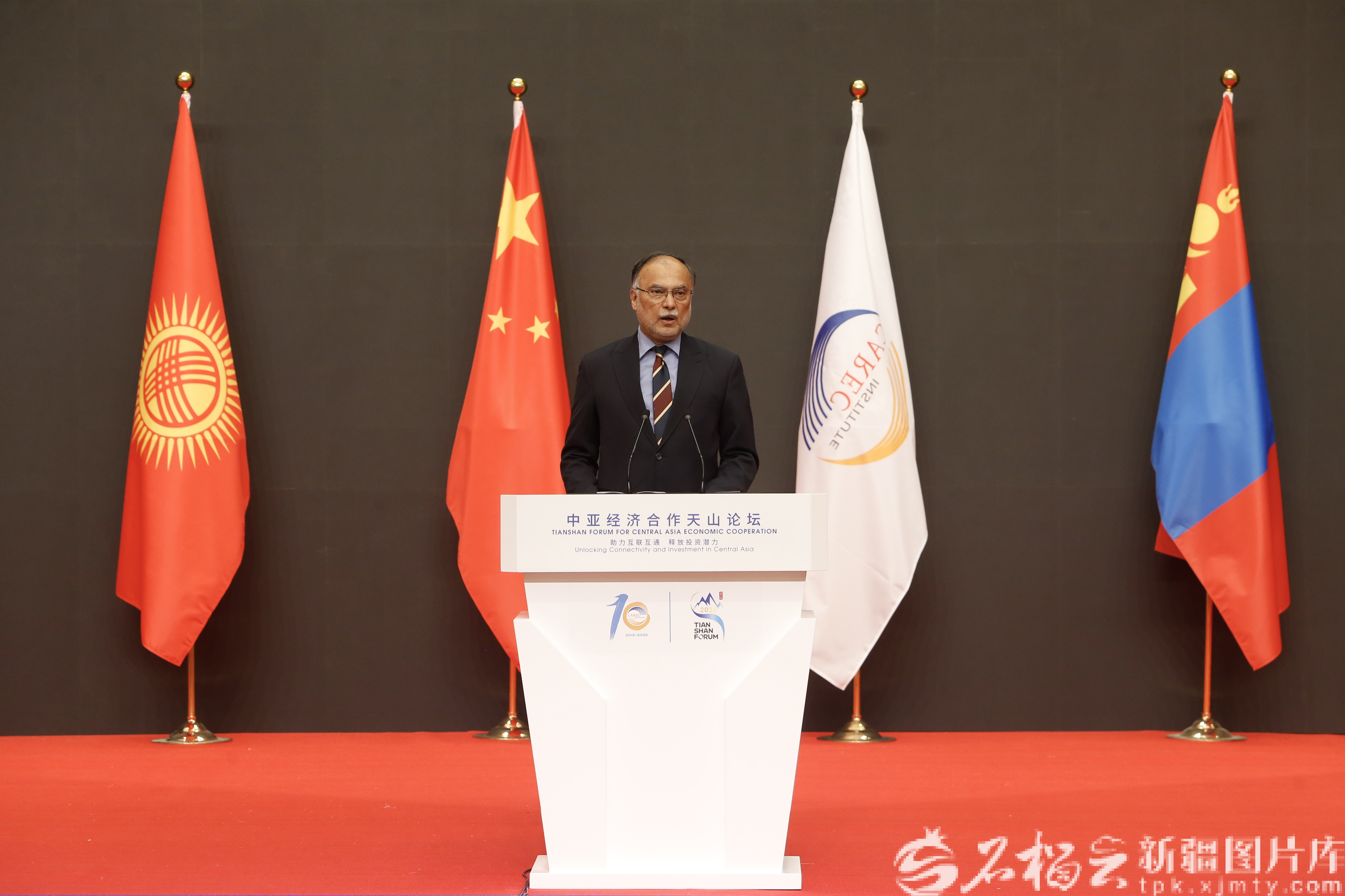 巴基斯坦規(guī)劃、發(fā)展與特別倡議部部長(zhǎng)阿赫?!ひ量税蜖栐谥衼喗?jīng)濟(jì)合作天山論壇上發(fā)言。天山網(wǎng)-新疆日?qǐng)?bào)記者 謝龍攝