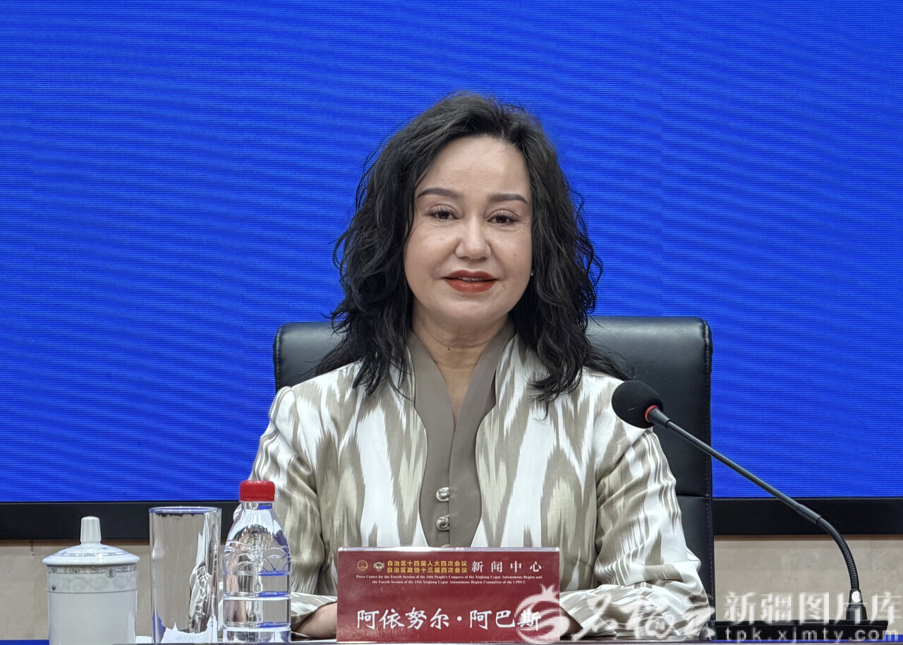 圖為自治區(qū)人大代表阿依努爾·阿巴斯答記者問。天山網(wǎng)-新疆日?qǐng)?bào)記者 李瑞攝