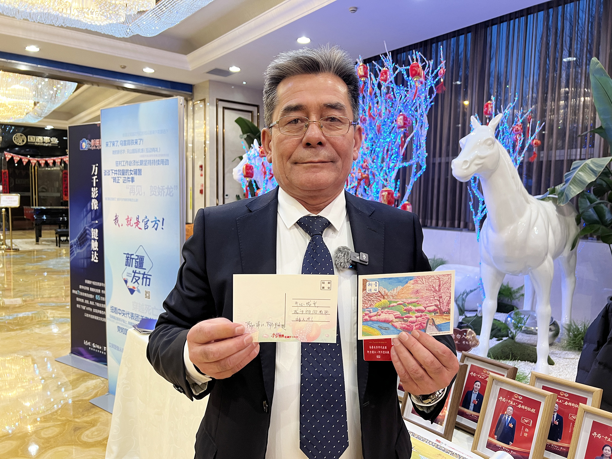 1月27日,自治區(qū)人大代表、新疆蘇齊農(nóng)業(yè)節(jié)水規(guī)劃設(shè)計(jì)研究院有限公司董事長(zhǎng)阿力甫江·阿不里米提展示為“童繪新疆”小作者寫的明信片。(攝影:仲兆豐)