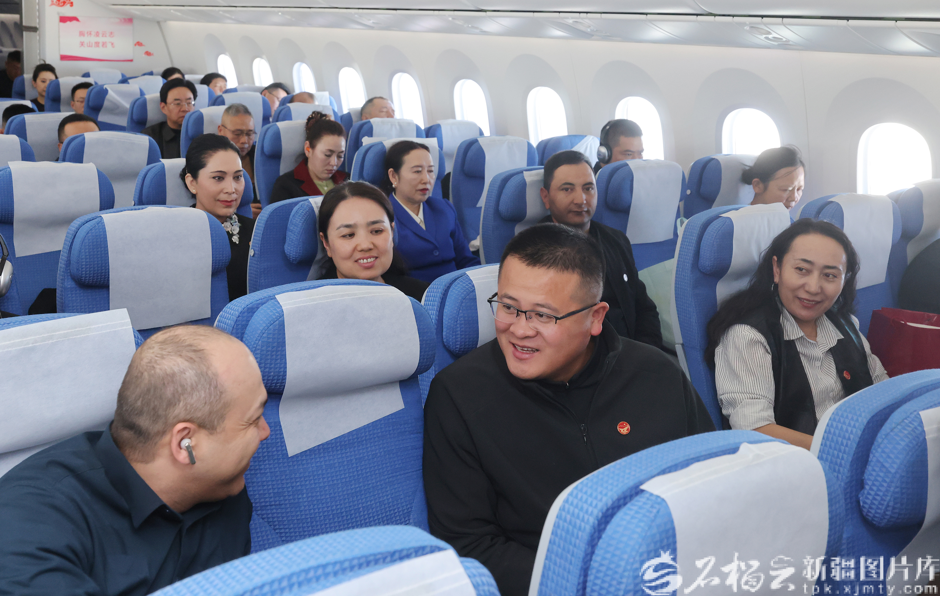 3月3日,出席十四屆全國人大四次會議的在疆全國人大代表乘機(jī)抵達(dá)北京。圖為在前往北京的飛機(jī)上,逄子劍代表(前排中)與木沙·買買提代表(左一)交流。天山網(wǎng)-新疆日報記者 崔志堅攝