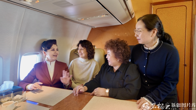 3月3日,出席全國政協(xié)十四屆四次會(huì)議的住疆全國政協(xié)委員抵京。圖為迪麗娜爾·阿布拉(左一)、木合拜爾·阿布都爾(左二)、阿衣木沙·托合塔洪(右二)、關(guān)芳芳委員在前往北京的航班上交流。天山網(wǎng)-新疆日?qǐng)?bào)記者 王昕攝