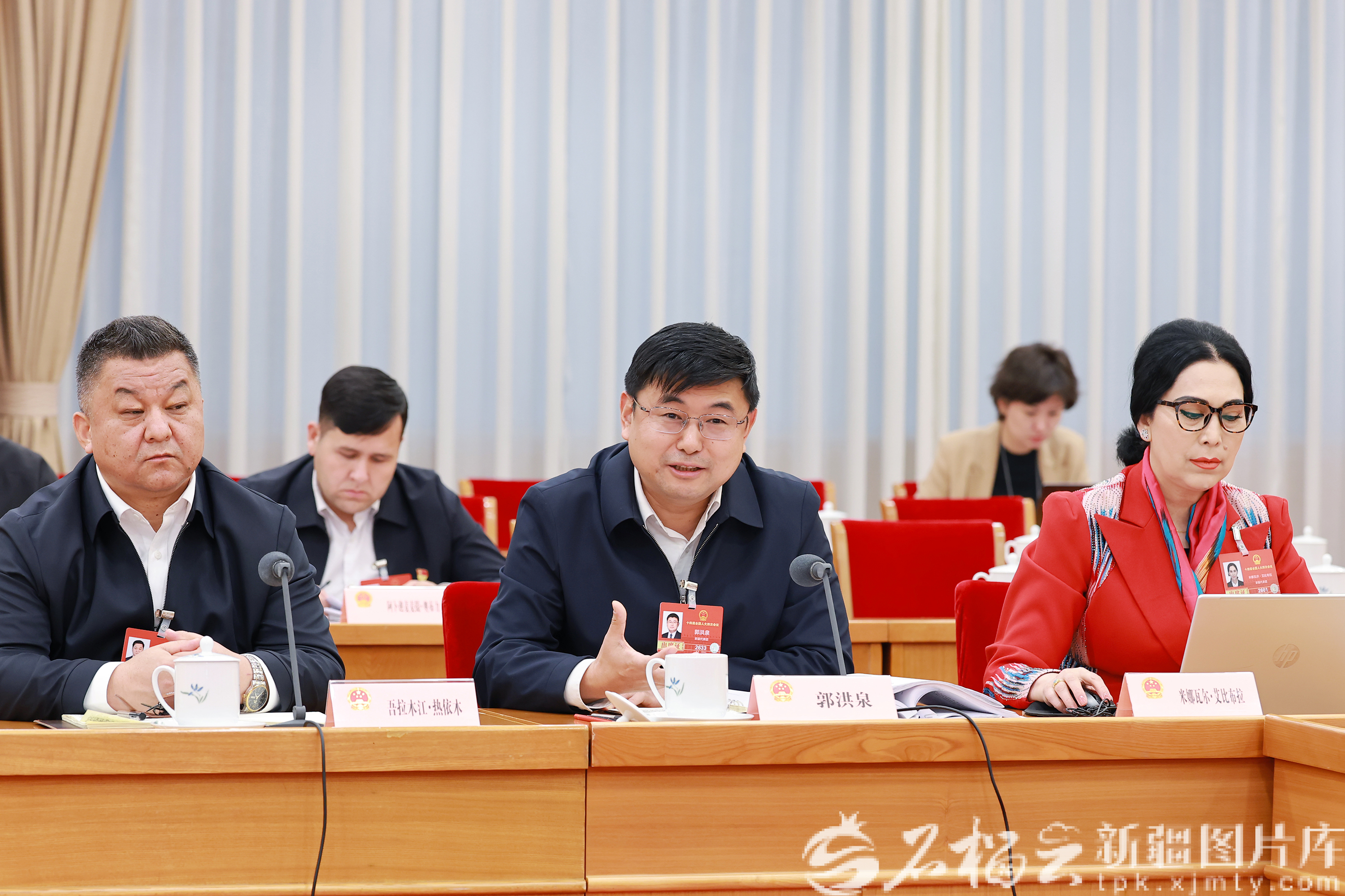 3月9日下午,十四屆全國(guó)人大四次會(huì)議新疆代表團(tuán)舉行小組會(huì)議,審議全國(guó)人大常委會(huì)工作報(bào)告、全國(guó)人大常委會(huì)關(guān)于法律清理工作情況和有關(guān)法律和決定處理意見的報(bào)告。圖為郭洪泉代表(前中)圍繞完善相關(guān)配套法律制度等內(nèi)容發(fā)言。天山網(wǎng)-新疆日?qǐng)?bào)記者 崔志堅(jiān)攝