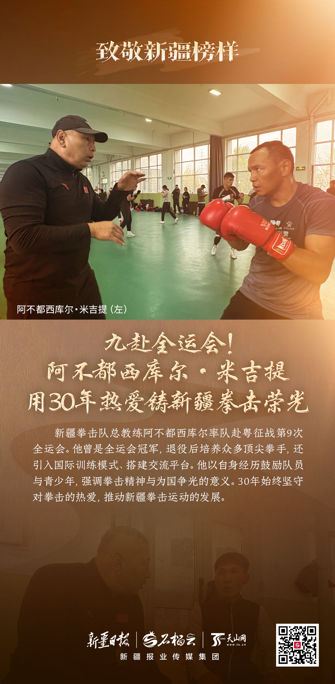 新疆拳擊隊總教練阿不都西庫爾·米吉提率隊赴粵征戰(zhàn)第9次全運(yùn)會。他曾是全運(yùn)會冠軍,退役后培養(yǎng)眾多頂尖拳手,還引入國際訓(xùn)練模式、搭建交流平臺。他以自身經(jīng)歷鼓勵隊員與青少年,強(qiáng)調(diào)拳擊精神與為國爭光的意義。30年始終堅守對拳擊的熱愛,推動新疆拳擊運(yùn)動的發(fā)展。