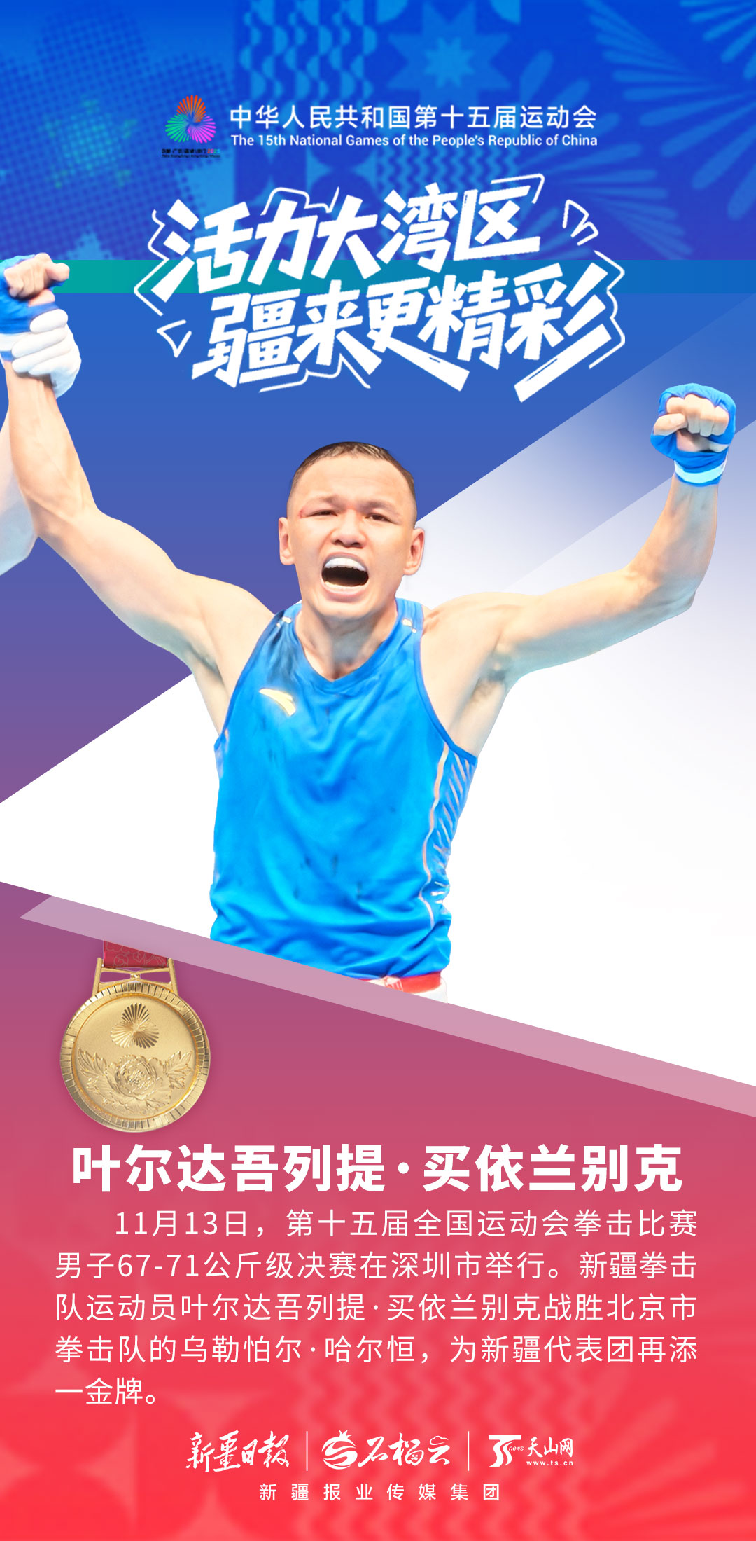 11月13日,第十五屆全國運動會拳擊比賽男子67—71公斤級決賽在深圳市舉行。新疆拳擊隊運動員葉爾達吾列提·買依蘭別克戰(zhàn)勝北京市拳擊隊的烏勒怕爾·哈爾恒,為新疆代表團再添一金牌。