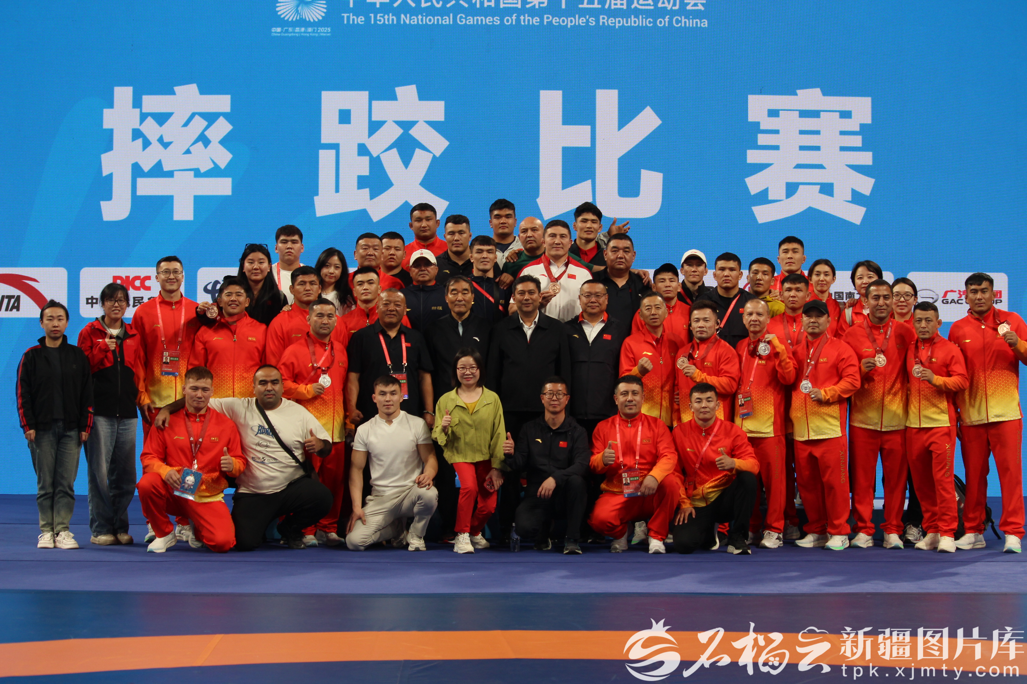 新疆摔跤隊(duì)運(yùn)動(dòng)員在第十五屆全國(guó)運(yùn)動(dòng)會(huì)現(xiàn)場(chǎng)合影留念。天山網(wǎng)-新疆日?qǐng)?bào) 記者王晶晶攝