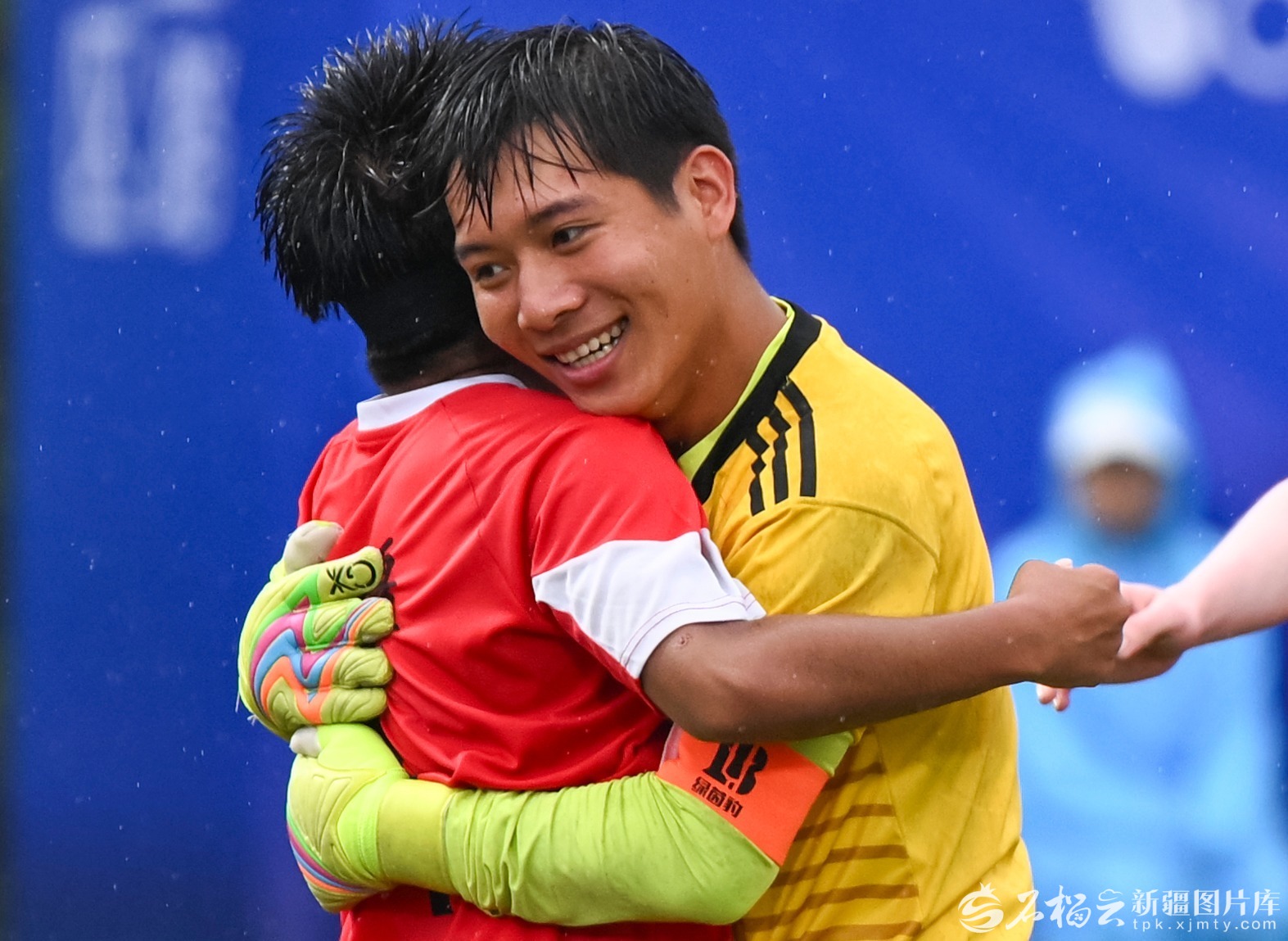 12月13日,盲人足球男子組小組賽,新疆隊球員比拉力·亞森(左)得分后與守門員艾木都拉·阿力木江擁抱慶祝。殘?zhí)貖W會官方信息服務(wù)平臺供圖