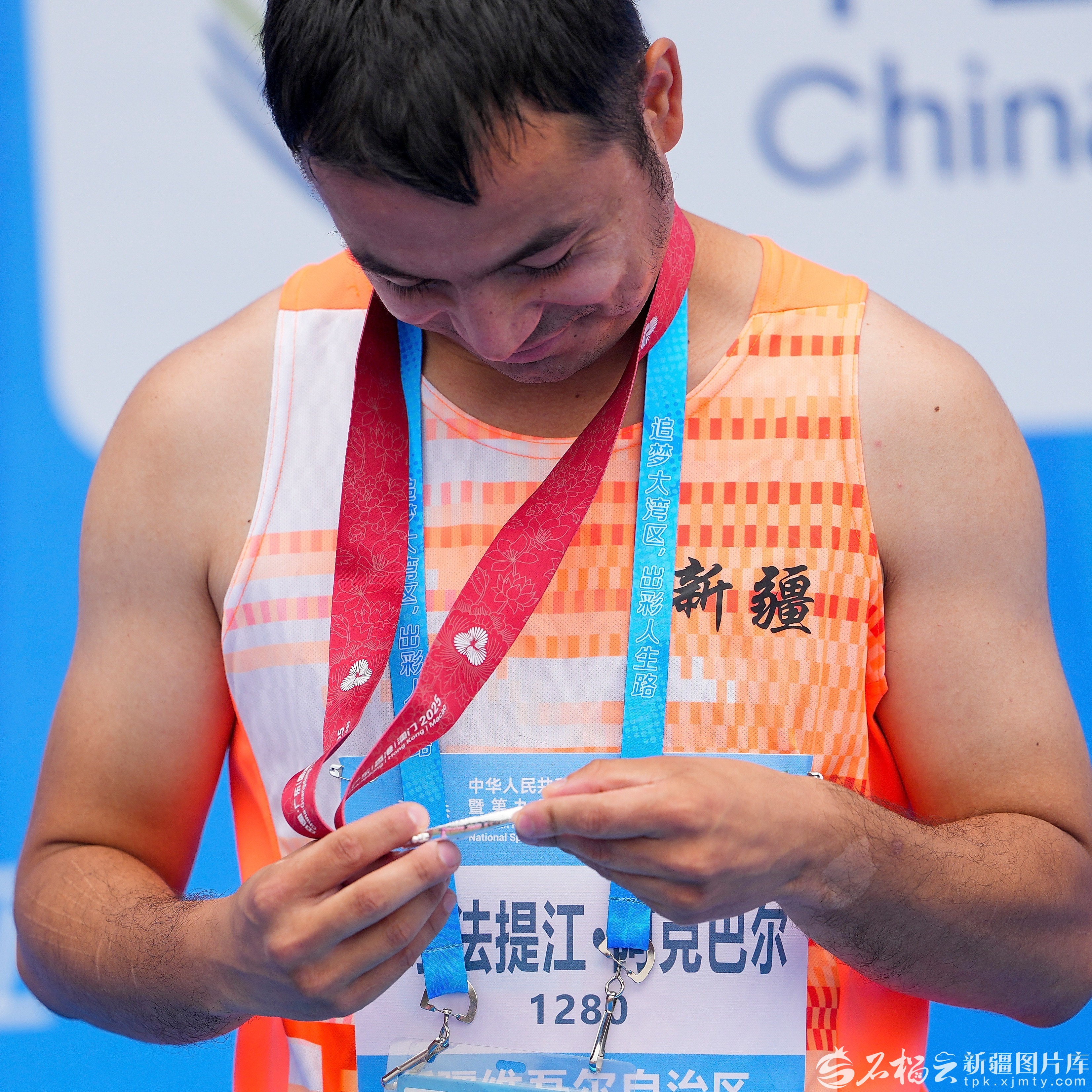 12月10日,在男子30歲以上組400米決賽頒獎儀式上,獲得亞軍的新疆隊選手阿爾法提江·阿克巴爾查看獎牌。殘?zhí)貖W會官方信息服務(wù)平臺供圖