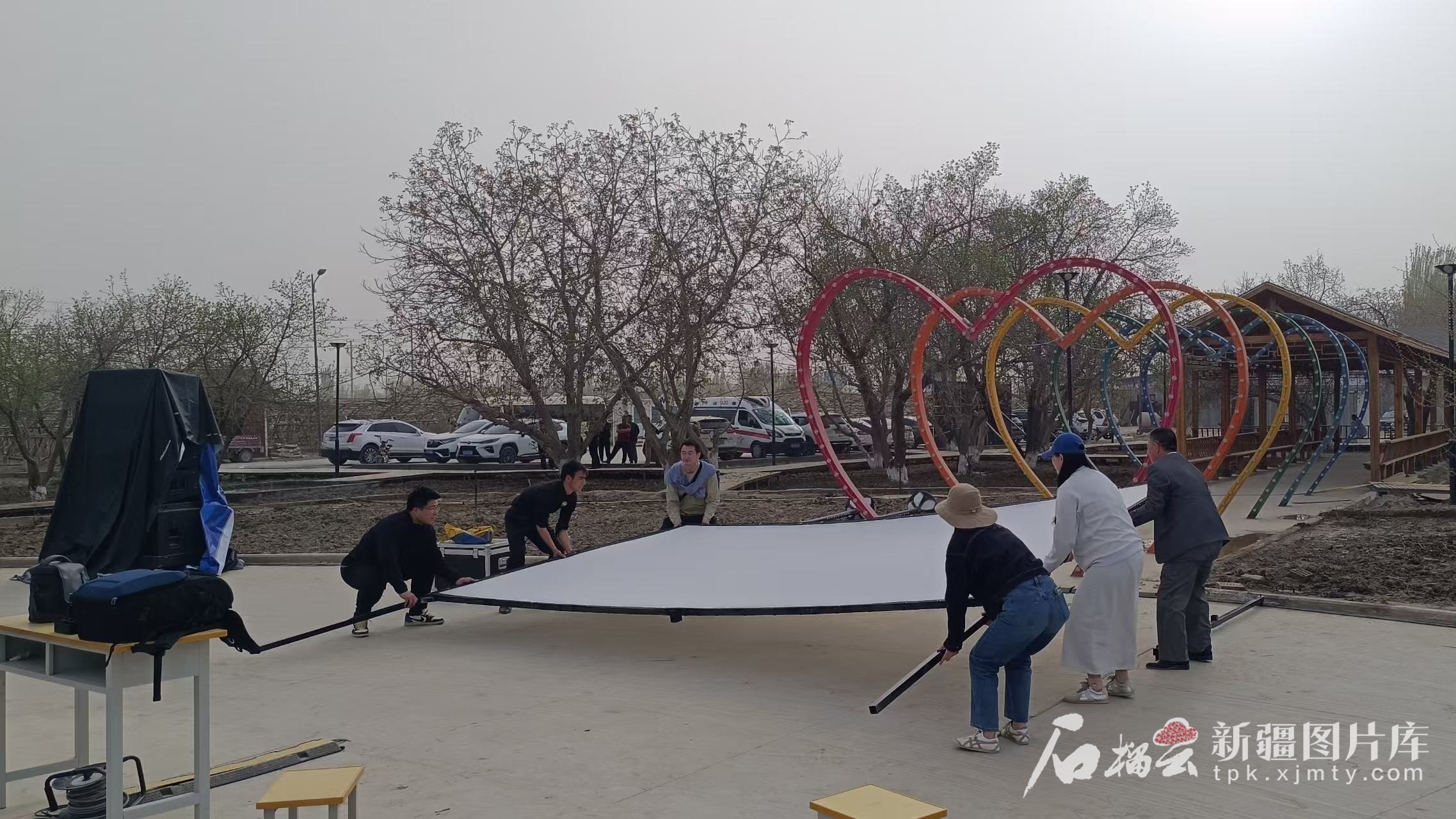 在阿瓦提縣舉辦的《地上的云朵》首映禮上,劇組在布置露天電影院。 天山網(wǎng)-新疆日報記者 任江 攝