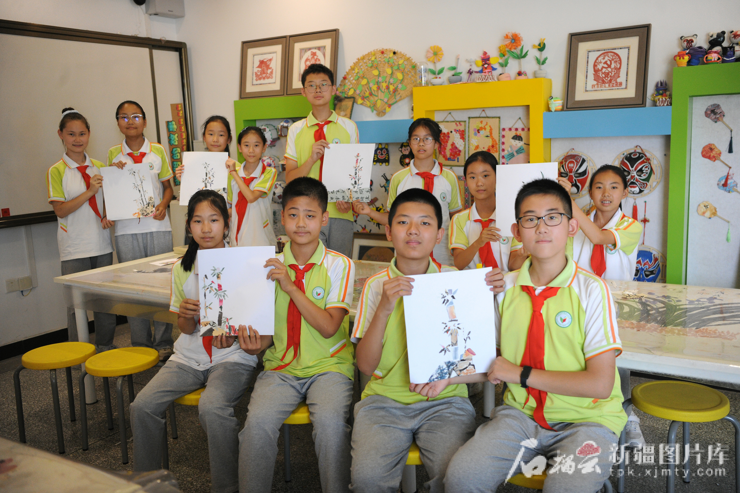 6月23日,烏魯木齊市第五十三小學(xué)學(xué)生展示自己創(chuàng)作的錦灰堆作品。
