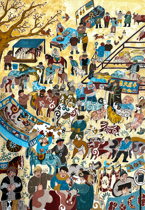 讓我們一同走進(jìn)這些色彩濃烈、質(zhì)樸鮮活的農(nóng)民畫(huà)作。每一筆都浸潤(rùn)著創(chuàng)作者對(duì)鄉(xiāng)土生活的深情,每一幅都定格了新疆農(nóng)牧民的喜悅與奮斗足跡。這些作品以最生動(dòng)的視覺(jué)語(yǔ)言,呈現(xiàn)了鄉(xiāng)村振興戰(zhàn)略下新疆大地的豐碩成果與蓬勃生機(jī)。