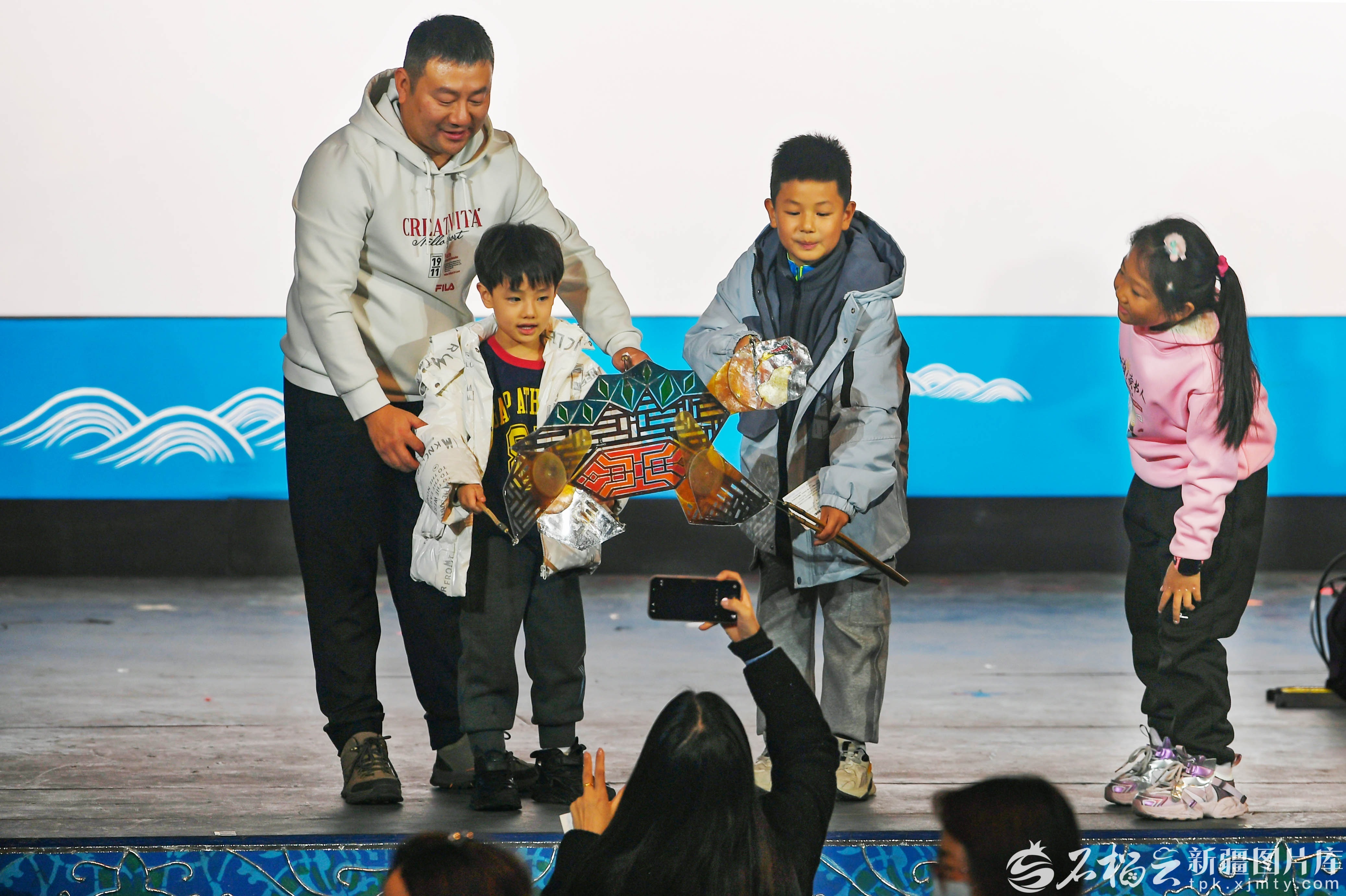 11月23日,大型皮影戲《人魚姑娘》表演結(jié)束后,皮影藝人和小觀眾合影。