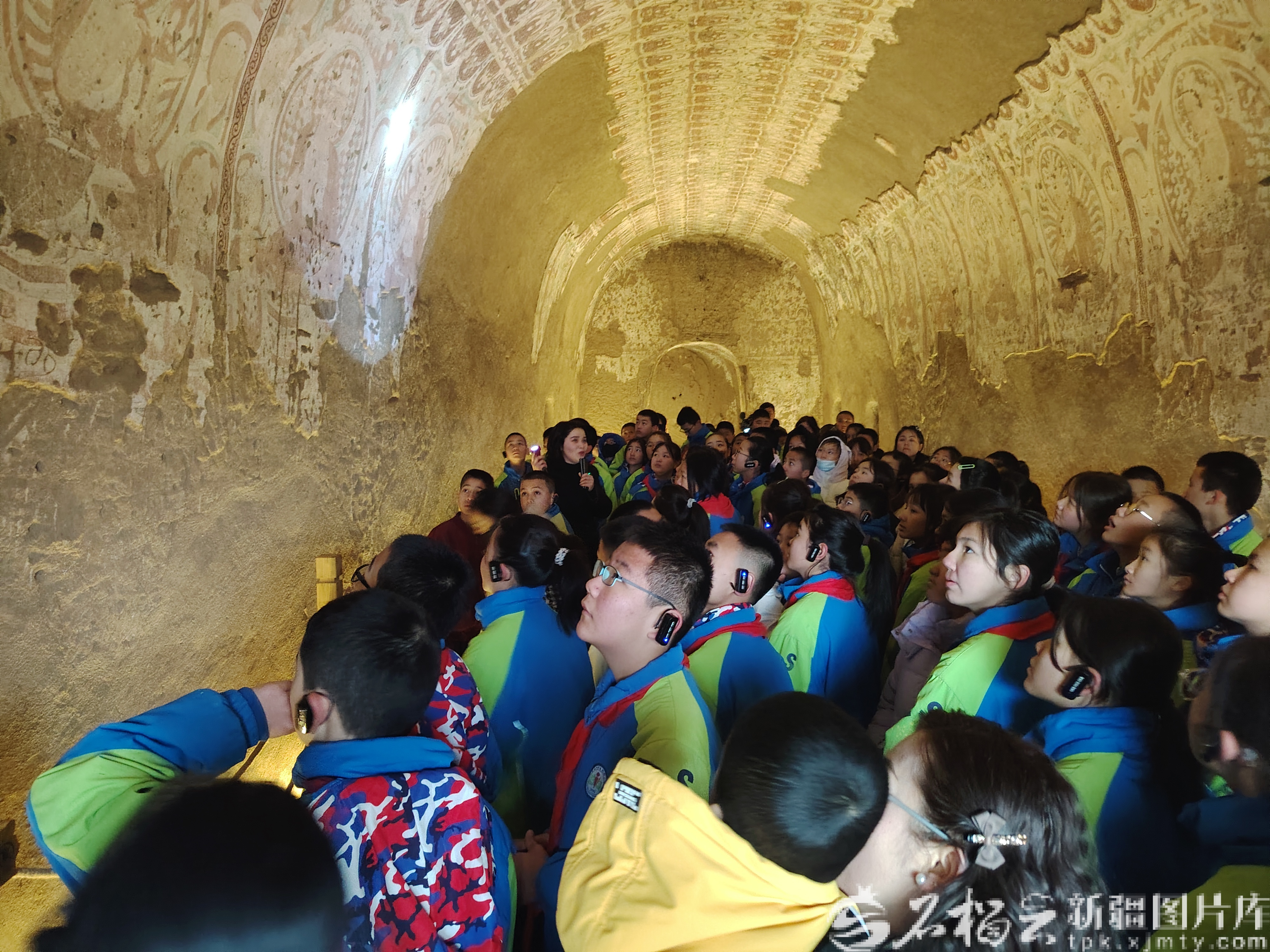 在交河故城雅爾湖石窟,高昌區(qū)第一小學(xué)六年級學(xué)生凱迪努爾·艾乃吐力一邊聽著講解員的講解,一邊通過AR技術(shù)看壁畫細(xì)節(jié),她拉著同學(xué)張子涵說:“看,咱們的家鄉(xiāng)就是文明交融的舞臺!”